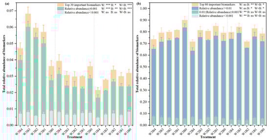 In order to provide further clarification on the effects of biochar on soil bacterial and fungal communities in mulched drip irrigation, a random forest model was employed to screen soil bacterial and fungal biomarkers at the genus level (Figure 3). The total value of the relative abundance of bacterial biomarkers in different treatments was only 2.15–6.82%, which was mainly composed of rare bacterial genera (relative abundance < 0.01%). Among these, the total relative abundance of bacterial biomarkers with relative abundance > 0.001% ranged from 1.69% to 6.02% and was statistically significant for all factors, while those with relative abundance < 0.001% ranged from 0.46% to 0.87% (Figure 3a). At the W3 irrigation level, the total relative abundance of bacterial biomarkers exhibited an increasing trend, followed by a subsequent decrease, peaking at values significantly higher than those at other irrigation levels under equivalent biochar application. The total relative abundance of soil fungal biomarkers across treatments ranged from 71.55% to 90.13%. This comprised fungal biomarkers with relative abundance > 0.01% (63.79–83.00%), those between 0.001% and 0.01% (4.28–7.48%), and those < 0.001% (0.69–1.09%) (Figure 3b). The differences observed in the total relative abundance of fungal biomarkers and in the total relative abundance of fungal biomarkers with relative abundance >0.01% were found to be statistically significant under the biochar level and water-biochar interactions.