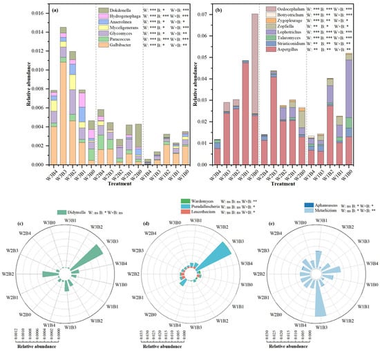 The relative abundance of soil fungal and bacterial biomarkers in different treatments affected by various factors: (a) soil bacterial biomarkers affected by irrigation, biochar and water-biochar interactions; (b) soil fungal biomarkers affected by irrigation, biochar and water-char synergism; (c) soil fungal biomarkers affected by the biochar alone; (d) soil fungal biomarkers affected by water-biochar interactions alone; (e) soil fungal biomarkers affected by both the biochar level and water-biochar interactions. *** represents highly statistically significant (p < 0.001), ** represents highly statistically significant (p < 0.01), * represents statistically significant (p < 0.05), and ns represents not significant among different treatments.