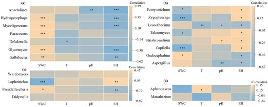 Soil bacterial biomarkers (Galbibacter, Glycomyces, Myceligenerans, and Hydrogenophaga) exhibited a significant positive correlation with SWC and a significant negative correlation with EH (Figure 5a); Paracoccus demonstrated a significant positive correlation exclusively with SWC. Soil fungal biomarkers Aspergillus and Leucothecium correlated negatively with both pH and EH. Zopfiella, Talaromyces, Zygopleurage, and Lophotrichus showed negative correlations with SWC but positive with EH; whereas Oedocephalum and Pseudallescheria demonstrated the reverse pattern (Figure 5b–d). It was found that only Dokdonella, Leucothecium, and Aphanoascus were significantly correlated with T. The findings suggested that the presence of bacterial and fungal biomarkers, influenced by irrigation and biochar application, exhibits heightened sensitivity to variations in SWC and EH.