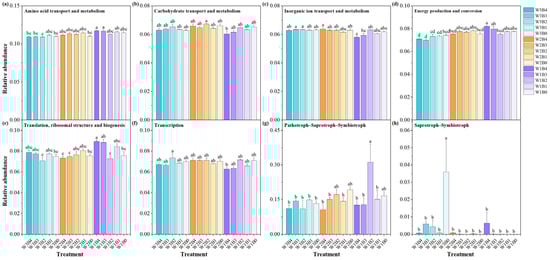 Functional prediction analysis using PICRUSt2 revealed that the primary functions of bacterial biomarkers in different treatment were as follows: Function unknown (17.22–17.97%), Amino acid transport and metabolism (10.69–10.96%), Translation, Ribosomal structure and biogenesis (7.35–7.86%), Energy production and conversion (7.19–7.44%), Cell wall/membrane/envelope biogenesis (6.21–6.69%), Transcription (5.62–6.30%), Carbohydrate transport and metabolism (5.70–5.85%), Inorganic ion transport and metabolism (5.63–5.99%), Replication, recombination, and repair (4.72–4.85%), and Coenzyme transport and metabolism (4.52–4.64%) (Figure S3a). Soil bacterial biomarker functional relative abundance exhibited relatively small changes under different treatments. The primary functions of bacterial biomarkers, namely amino acid transport and metabolism, transcription, and carbohydrate transport and metabolism, were statistically significant at varying levels of irrigation or biochar application, while they were non-significant under water-biochar interactions. (Table S7). A comparison of the W3 level with the B0 treatment reveals that biochar application resulted in an increase in the relative abundance of carbohydrate transport and metabolism by 0.42–4.07% and a decrease in the relative abundance of energy production and conversion by 0.83–5.73%. The application of biochar at the W2 level resulted in an increase in the relative abundance of amino acid transport and metabolism and energy production and conversion by 1.22–3.95% and 0.10–3.90%, respectively. Conversely, at the W1 level, biochar application led to a reduction in the relative abundance of carbohydrate transport and metabolism by 0.45–7.35% (Figure 6a,b,d). At the W3 and W1 levels, the B3 and B4 treatments exhibited an augmentation in the relative abundance of Translation, ribosomal structure and biogenesis, concomitant with a diminution in the relative abundance of Inorganic ion transport and metabolism and Transcription (Figure 6c,f). However, no significant differences were observed between the treatments with and without biochar application at the same irrigation level.