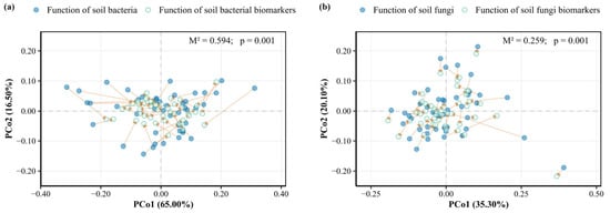 Interestingly, it was found that the functional composition of soil bacterial and fungal biomarkers was similar to that of the entire soil bacterial and fungal functional composition (Figure S5). To further investigate this, we conducted correlation analyses between the function of soil bacteria and fungi biomarkers and the function of overall soil bacteria and fungi. The Mantel test revealed a significant positive correlation between the function of bacterial biomarkers and total soil bacteria (r = 0.441, p < 0.001), and the same be-tween the function of soil fungi and total soil fungi (r = 0.841, p < 0.001) (Table S8). Procrustes analysis indicated significant structural similarity between the functional composition of soil bacterial biomarkers and total soil bacteria (M2 = 0.594, p = 0.001), as well as between soil fungal biomarker and total soil fungi (M2 = 0.259, p = 0.001) (Figure 7).