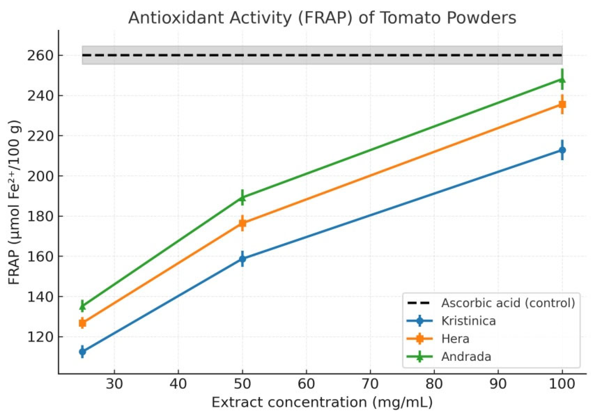 APA StyleMarcu, I., Radu, G.-L., & Dăncilă, A. M. (2025). Analysis of the Antioxidant Capacity of Whole-Fruit Tomato Powder Using the Ferric Reducing Antioxidant Power (FRAP) Assay—An Eco-Friendly Approach for the Valorization of Horticultural Products. Horticulturae, 11(9), 1145. https://doi.org/10.3390/horticulturae11091145