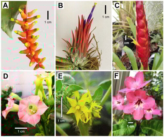 Characteristic flower images of the plant genera used for screening of hormone-like substances in stigma exudate using UPLC-ESI-MS (Agilent Technologies, Santa Clara, CA, USA): (A)—Aechmea racinae var. tubiformis (Bromeliaceae); (B)—Tillandsia ionantha (Bromeliaceae); (C)—Vriesea incurvata (Bromeliaceae); (D)—Nicotiana tabacum cv. Petit Havana (Solanaceae); (E)—Lycopersicon esculentum (Solanaceae); and (F)—Streptocarpus cv. Salmon Sunset (Gesneriaceae).