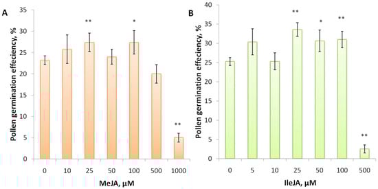 Effect of jasmonic acid derivatives methyl jasmonate (MeJA) (A) and jasmonoyl-L-isoleucine (IleJA) (B) on pollen germination in Nicotiana tabacum cv. Petit Havana; * p < 0.05, ** p < 0.01.