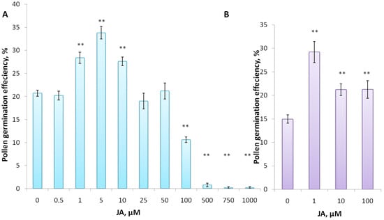 Effect of jasmonic acid on pollen germination in Nicotiana tabacum cv. Petit Havana (A) and Streptocarpus cv. Salmon Sunset (B); ** p < 0.01.