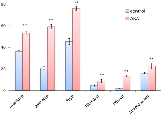 Effect of abscisic acid (10 μM) on pollen germination in Nicotiana tabacum and different genera of Bromeliaceae and Gesneriaceae families; ** p < 0.01.
