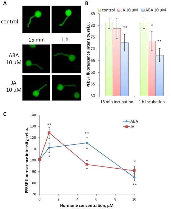Effect of jasmonic (JA) and abscisic (ABA) acids on H2O2 level in tobacco pollen tubes assessed by fluorescent PFBSF staining during short-term (15 min) and long-term incubation (1 h): (A) typical fluorescent images (10 μM); (B) mean fluorescence intensity (10 μM); and (C) the effect of different concentrations of hormones on fluorescence intensity during long-term treatment; * p < 0.05, ** p < 0.01 to control meanings.