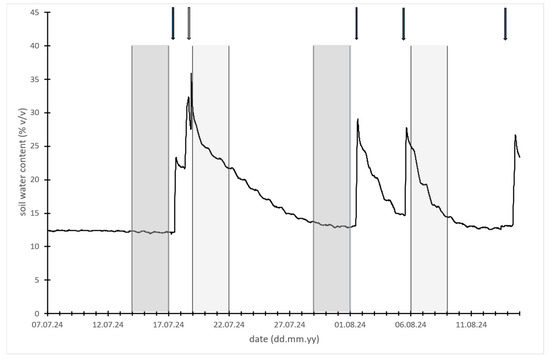 Soil water content (% v/v) measured 30 cm deep in tree rows. Arrows with continuous line indicate irrigation events (50 L/tree), while arrow with dashed line marks natural rainfall (27.2 mm in 6 h). Moderately and light gray zones indicate 3-day periods of sap flow measurements.