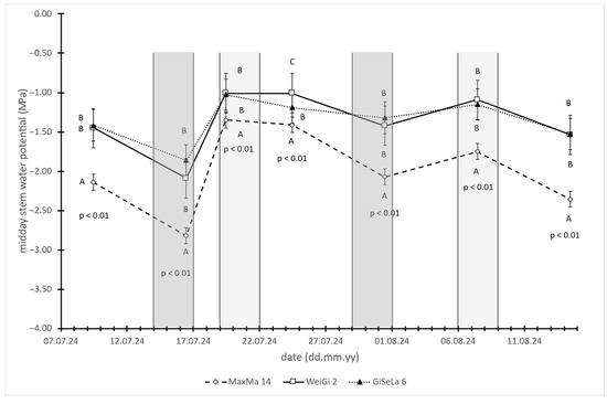 The MSWP values followed a similar trend: increases of 0.83 and 0.17 MPa were recorded for GiSelA 6, 1.09 and 0.34 MPa for WeiGi 2, and 1.47 and 0.32 MPa for MaxMa 14. Thus, MaxMa 14 showed the greatest response to irrigation, while GiSelA 6 showed the smallest response, with WeiGi 2 consistently showing an intermediate response.