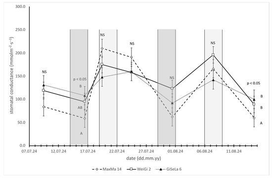 Stomatal conductance (gs) values of cherry trees on MaxMa 14, WeiGi 2, or GiSelA 6 rootstocks. Every data point represents average of 10 individual measurements (n = 10), while error bars indicate standard errors of mean (SEs). Different letters on the same day denote significant differences among rootstocks, according to Tukey HSD range test. Moderately and light gray zones indicate 3-day periods of sap flow measurements.