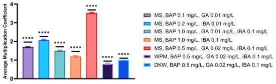 | MS, BAP 1.0 mg/L, GA 0.01 mg/L, IBA 0.1 mg/L | 11 | 66 ± 1.00 c | 1.46 | 2.1 ± 0.5 abcdfg | 3 |