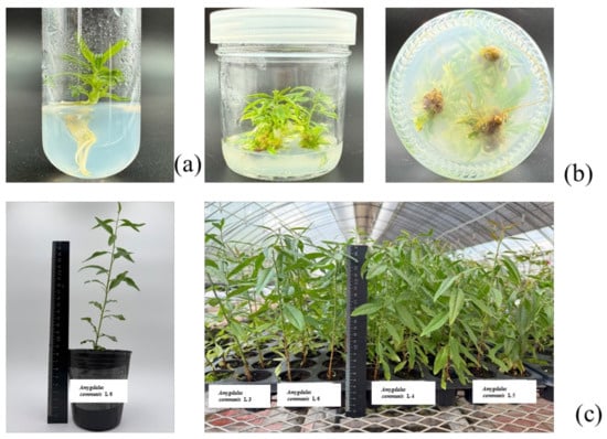 - Isikalan, C.; Adıyaman Akbaş, F.; Namlı, S.; Tilkat, E.; Başaran, D. In Vitro micropropagation of almond (Amygdalus communis L. cv. Nonpareil). Afr. J. Biotechnol. 2008, 7, 1875–1880. [Google Scholar][Green Version]