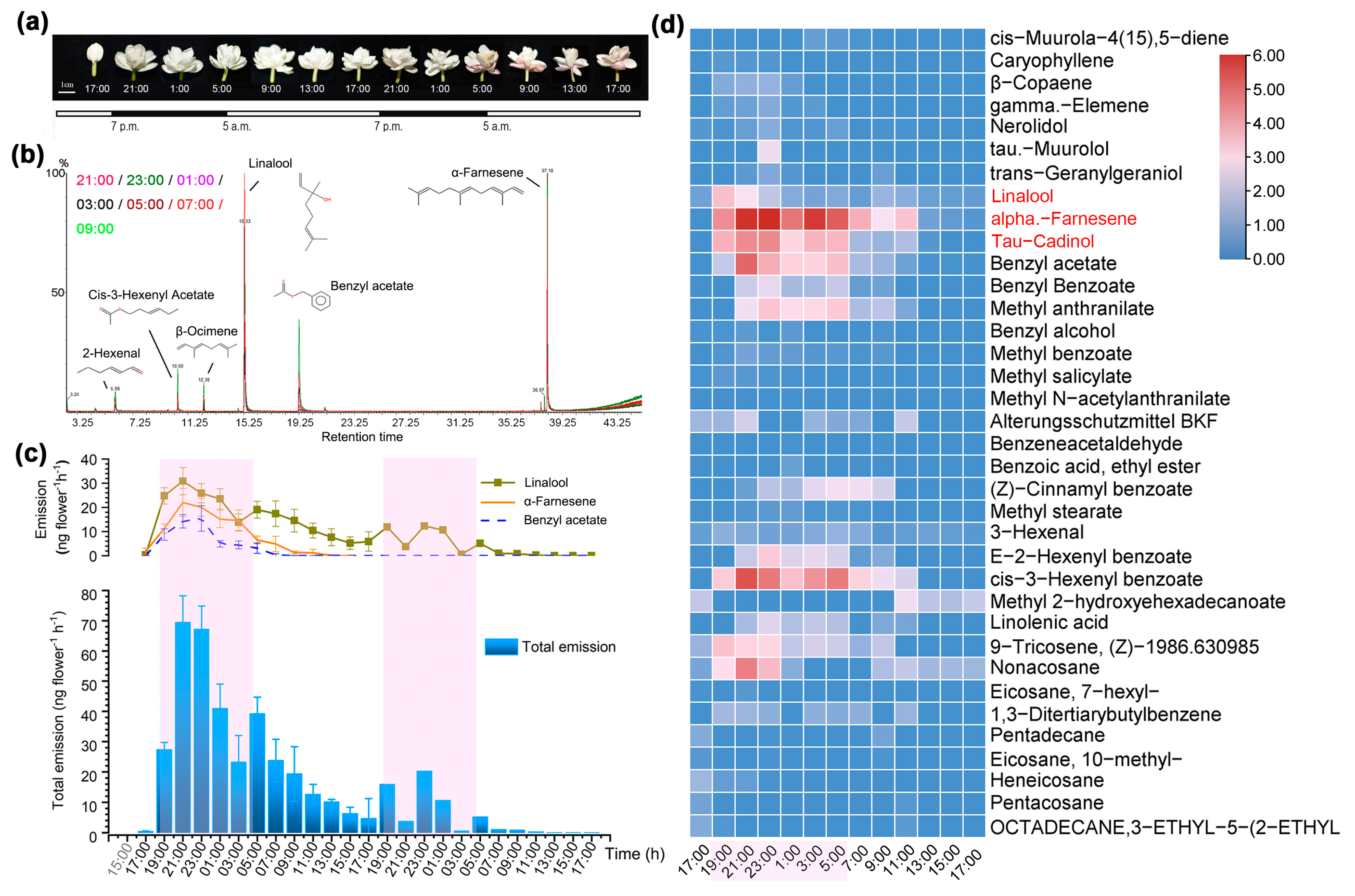 Figure 1. (a) Phenotypic changes in jasmine flowers at 4 h intervals from flower opening to senescence. The light/dark cycle is indicated by white (light) and black (dark) bars below the panel. Scale bar represents1.0 cm; (b) overlay of representative GC-MS spectrum of the headspace VOCs during the first 12 h, when the emission is maximum; (c) headspace emission of floral volatiles during the 48 h lifetime of the flower; pink shaded areas mark night-time intervals; (d) volatile compounds in petal extracts at time points during the 24 h of flower opening, with night-time intervals highlighted as pink blocks; compounds were quantified using an internal standard (Supplementary Data Set S1), and their abundances (μg·g−1 FW) were log2-transformed to generate the heat map.