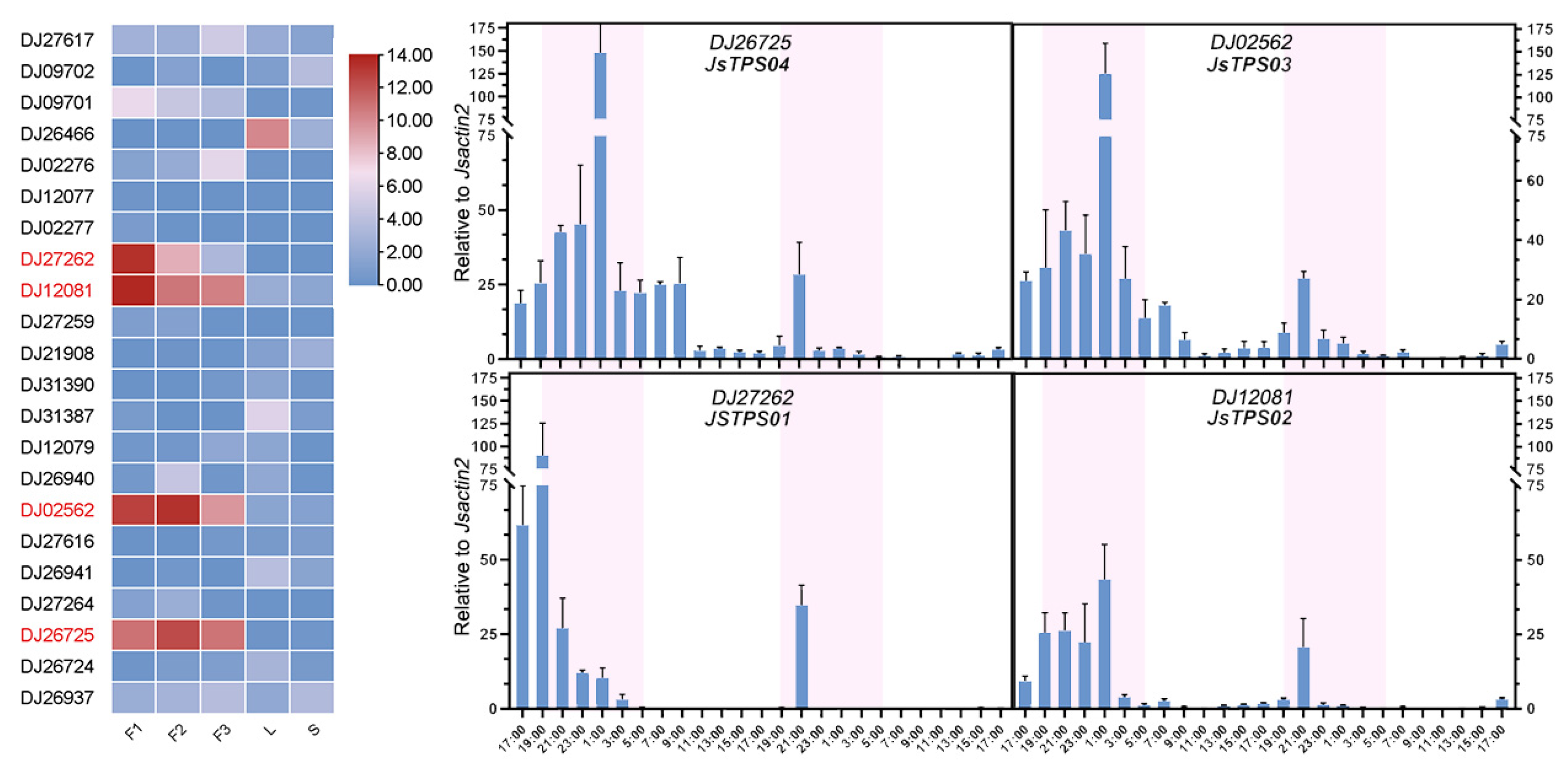 Figure 2. A heat map depicting the normalized FPKM derived from the transcriptome data and transcript abundance of the most highly expressed TPS genes (highlighted in red in the heat map) in petals during floral lifetime. The relative expression level of target genes was calculated using the 2−ΔC(T) method using JsACTIN2 as the reference gene. Pink shaded areas in the right-hand panel mark night-time intervals.