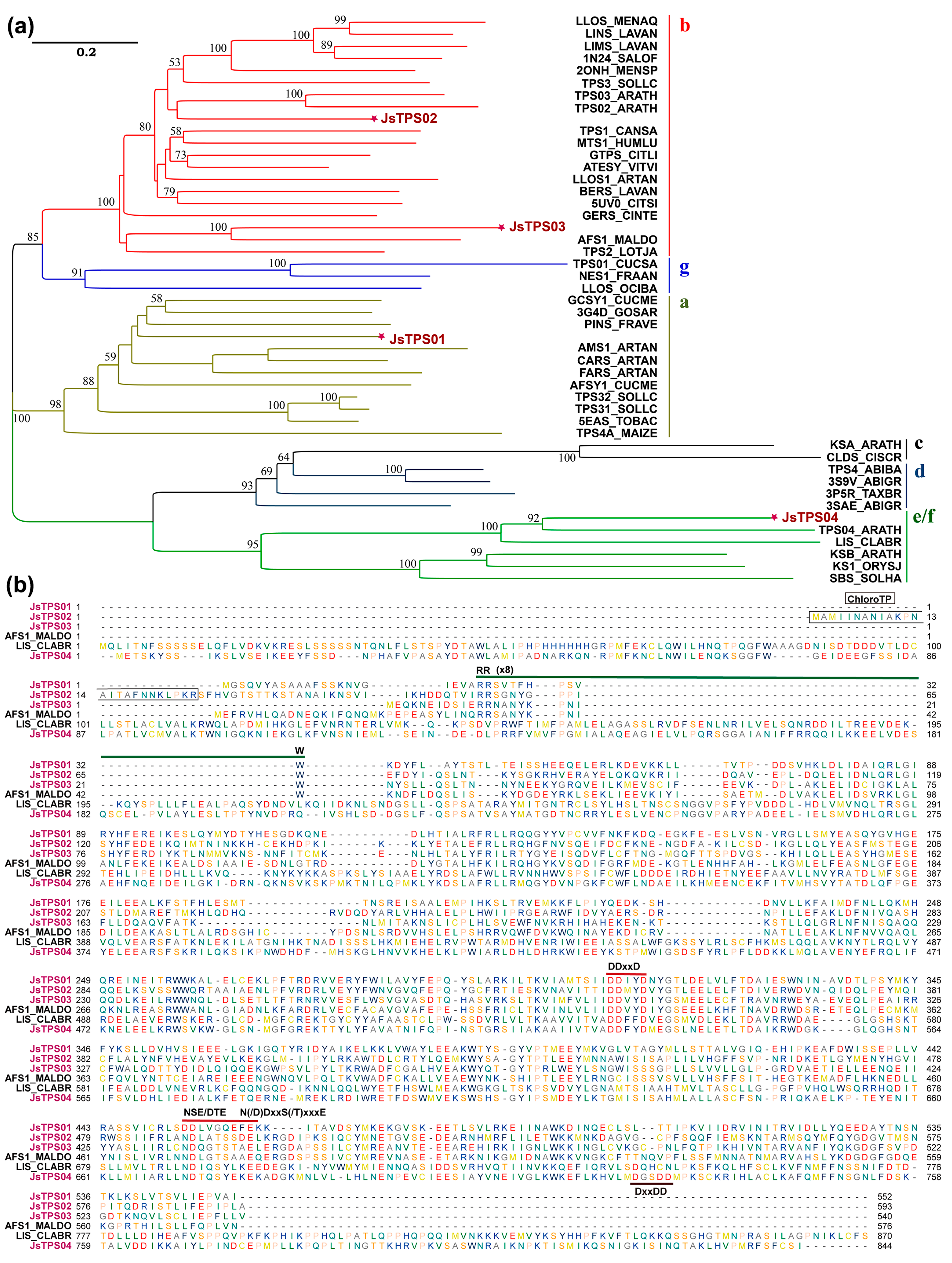 Figure 3. (a) Phylogenetic relationship of JsTPSs with other terpene synthases of known function from other species, using amino acid sequences (named using SWISS-Prot codes, PDB accession, or NCBI accession; see Table S3). The tree was constructed using MEGA X ver. 10.1.8 and visualized via FigTree ver. 1.4.4. The scale bar represents amino acid residue substitution rate per site. Subgroups are depicted with color lines, and bootstrap values greater than 50 are shown; lowercase letters (a, b, c, d, e/f, g) denote the six TPS subfamilies discussed in the text. (b) amino acid sequence alignment showing the conserved motifs in the JsTPS proteins together with those of the (E,E)-alpha-farnesene synthase 1 from apple (AFS1_MALDO) [67] and the S-linalool synthase from Clarkia breweri (LIS_CLABR) [62]. The predicted chloroplast transit peptide in JsTPS02 is boxed. The known functional motifs RRX8W, DDXXD, NSE/DTE, and DXXD are labeled.
