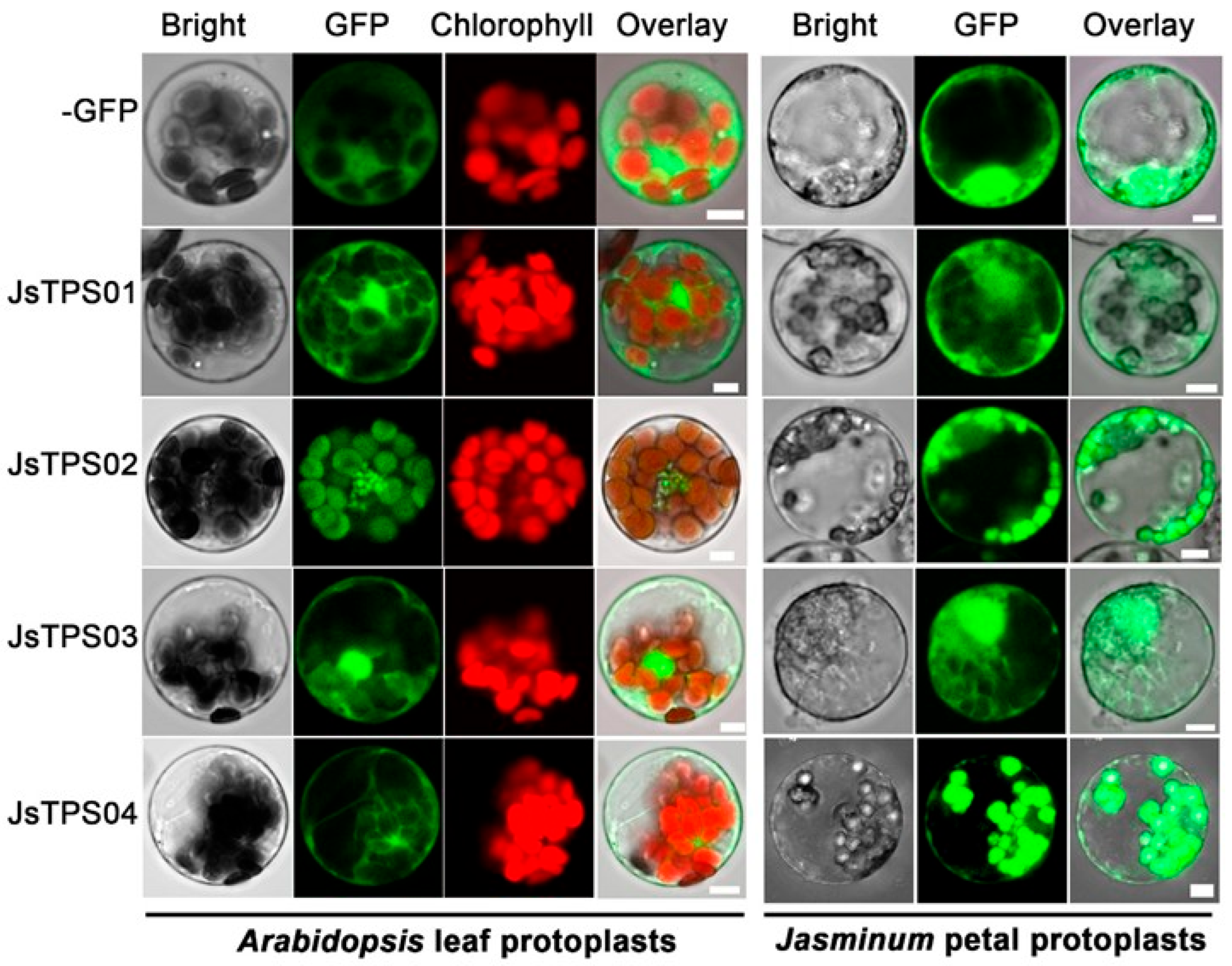 Figure 4. The four JsTPSs, in fusion with a C-terminal GFP tag, were transiently expressed in protoplasts of Arabidopsis rosette leaves or Jasminum petals. GFP fluorescence was observed at 470 nm excitation and 525 nm emission; chlorophyll fluorescence was detected at 545 nm excitation and 620 nm emission. The scale bar represents 5 µm.
