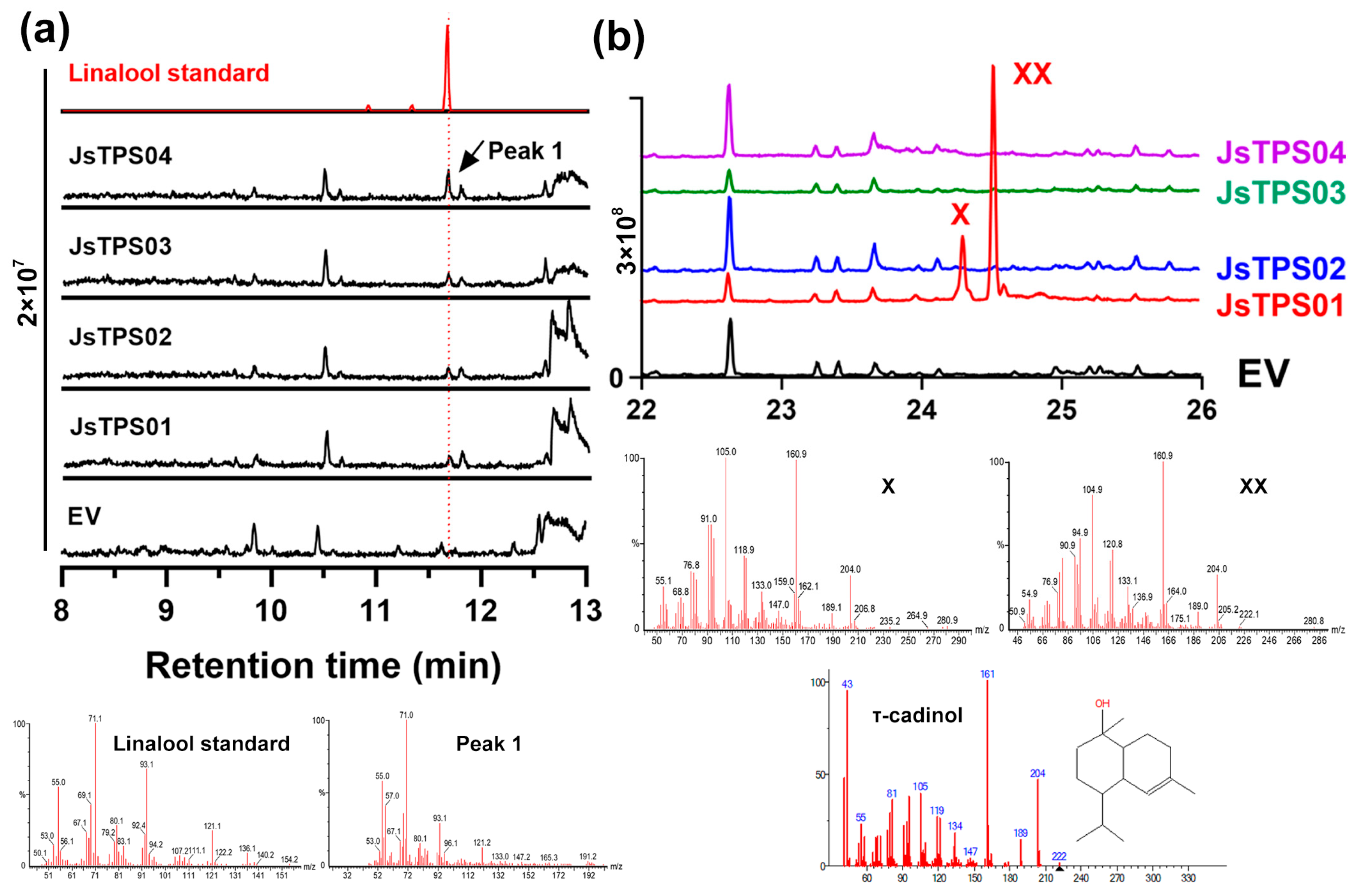 Figure 5. (a) Linalool was produced in JsTPS04-transfected leaves; (b) a sesquiterpenoid product, τ-cadinol, was generated in JsTPS01-expressing yeast cells; the peaks marked “X” and “XX” are newly formed products that both match τ-cadinol in NIST2020.
