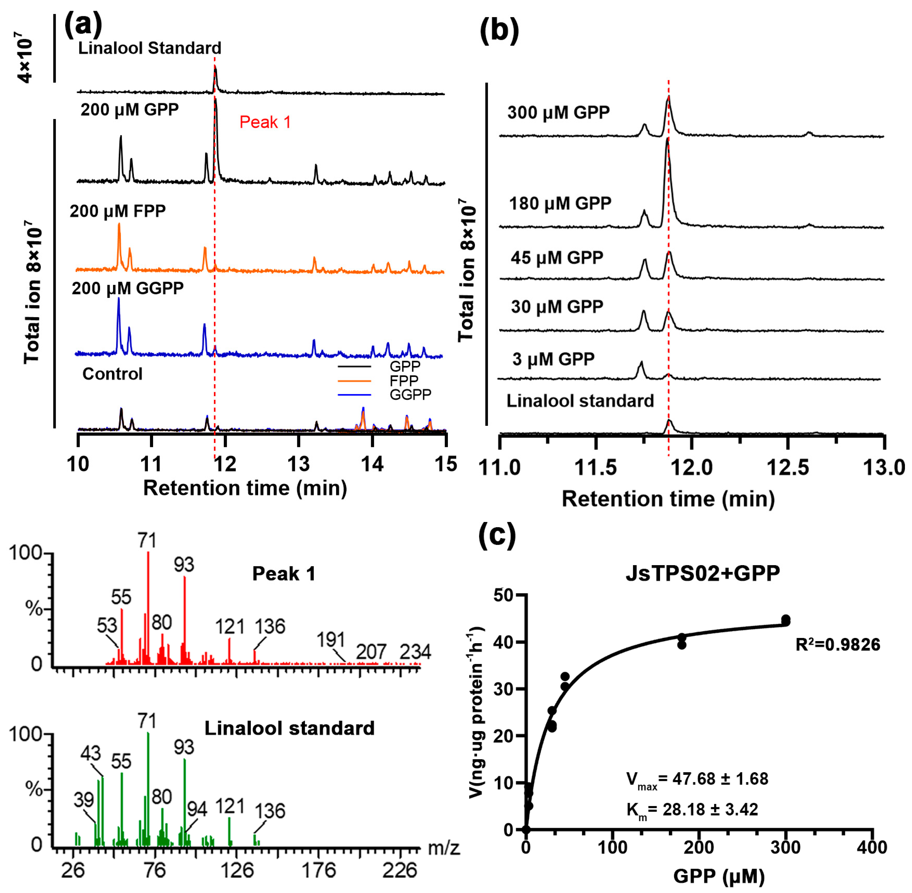 Figure 6. (a) Incubation with GPP, FPP, and GGPP up to 200 µM resulted in linalool (upper panel); comparison of the mass spectrum of the enzymatic product with that of the authentic compound linalool (lower panel). (b) Representative chromatograms of the reaction products; (c) curve fitting of JsTPS02 against GPP. In panels a and b, the red dashed lines denote the retention-time position of the authentic linalool standard.