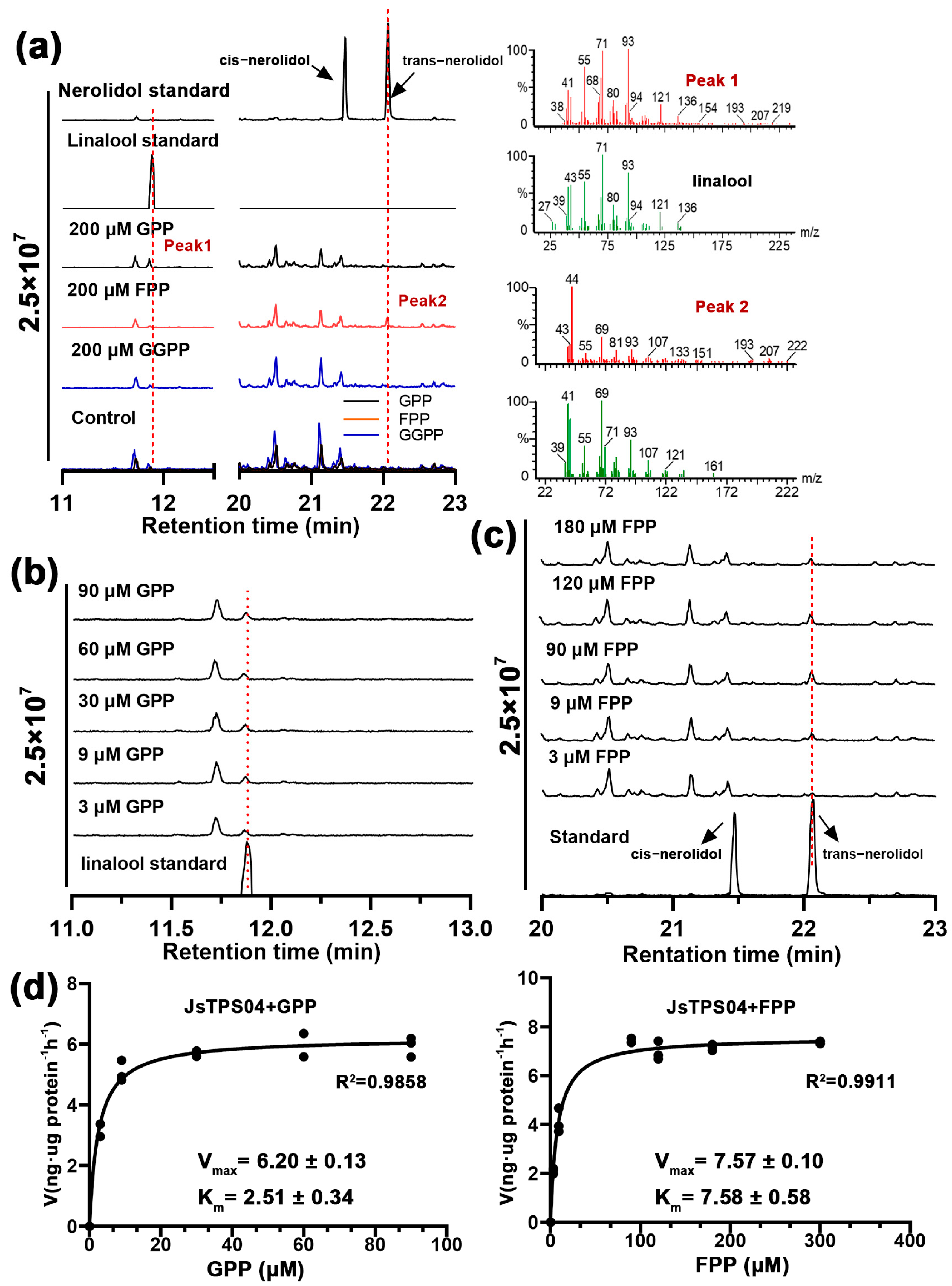 Figure 7. (a) Incubation with GPP, FPP, and GGPP up to 200 µM resulted in linalool and trans-nerolidol (left panel); comparison of the mass spectrum of the enzymatic product with that of the authentic compounds, linalool and trans-nerolidol (right panel). (b) Representative chromatograms of the reaction products of JsTPS04 with GPP; (c) representative chromatograms of the reaction products of JsTPS04 with FPP; (d) curve fitting of JsTPS04 against two substrates. In panels a–c, red dashed lines mark the retention-time positions of the authentic standards linalool and trans-nerolidol.