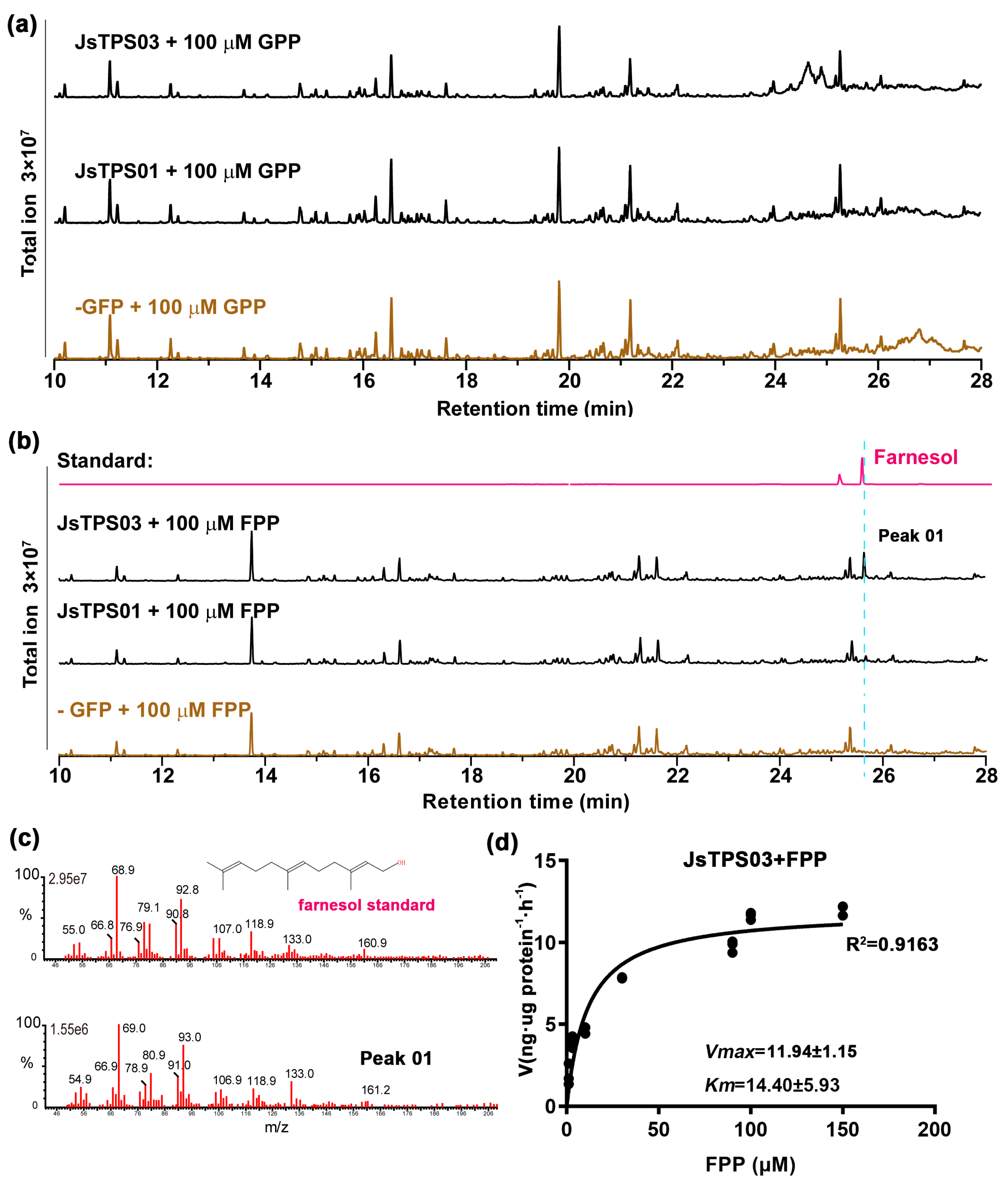 Figure 8. (a) Incubation with GPP up to 100 µM resulted in no significant new product peak; (b) a new product corresponding to farnesol was formed by the activity of JsTPS03 using FPP as substrate; (c) comparison of the mass spectrum of the enzymatic product with that of the authentic compound farnesol; (d) concentration-dependent reaction kinetics of the JsTPS03 against FPP and the apparent Michaelis–Menten parameters. In panel b, the blue dashed line denotes the retention-time position of the authentic farnesol standard.