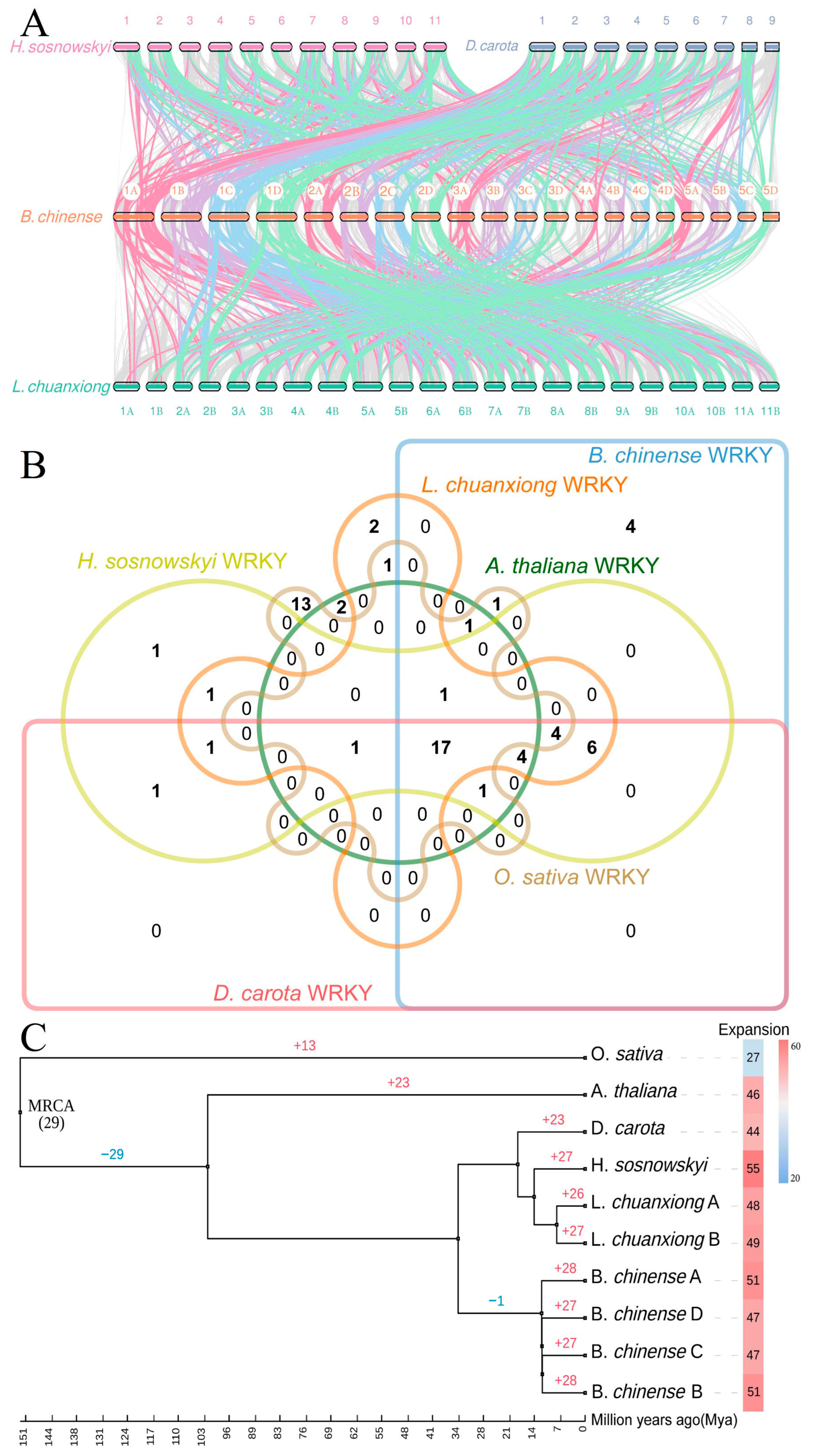 3.4. Comparative Genomics and Evolutionary Dynamics of BcWRKYs in Apiaceae Family