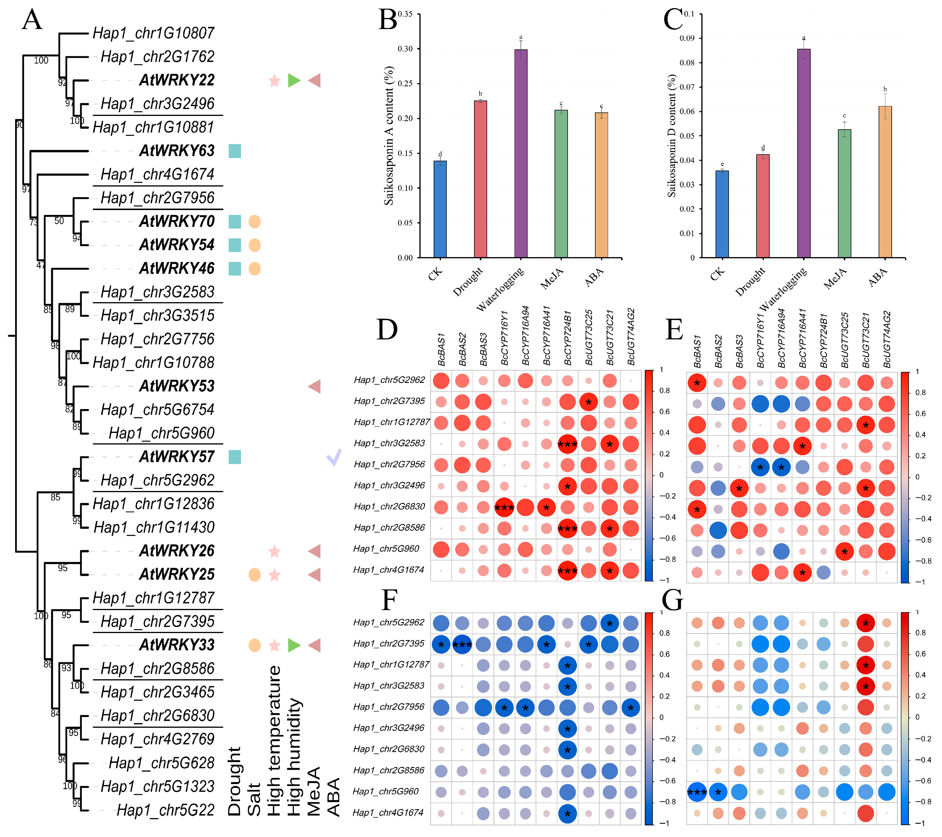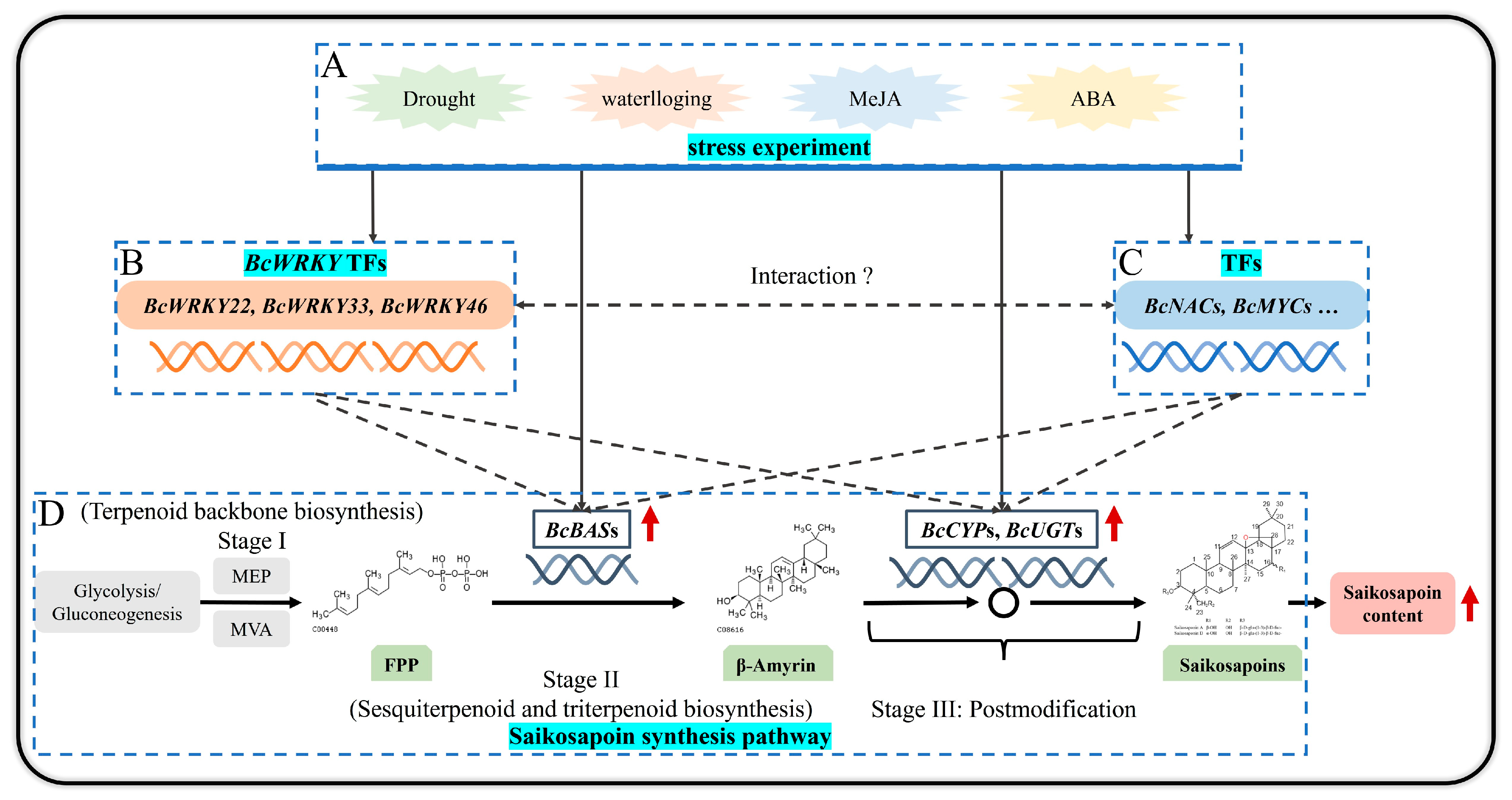 2.7. Expression Profiling of BcWRKYs and Saikosaponin Biosynthetic Genes Under Abiotic Stress by qRT-PCR