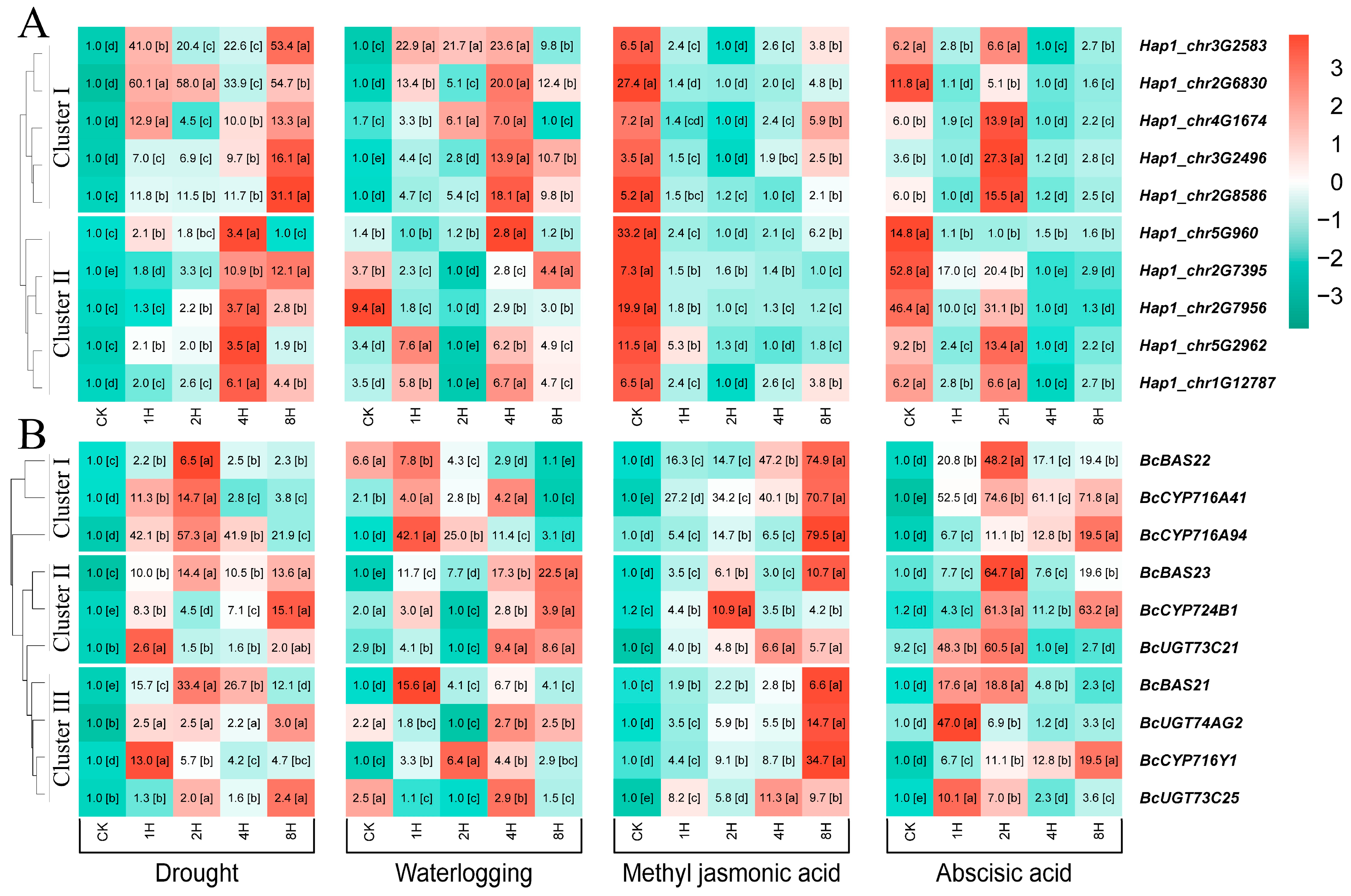 - Yang, L.; Qiao, L.; Su, X.; Ji, B.; Dong, C. Drought Stress Stimulates the Terpenoid Backbone and Triterpenoid Biosynthesis Pathway to Promote the Synthesis of Saikosaponin in Bupleurum chinense DC. Roots. Molecules 2022, 27, 5470. [Google Scholar] [CrossRef]