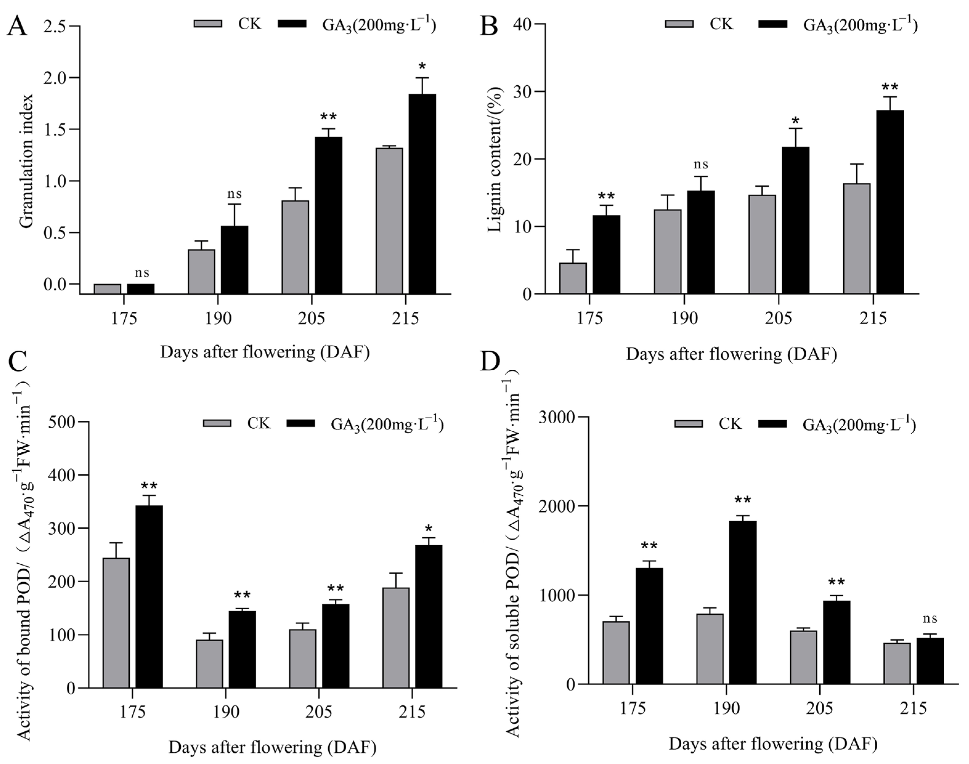 Figure 1. Changes in lignin accumulation and POD activity during pomelo growth and development. (A) Variation in the granulation index of ‘Sanhong’; (B) Variation in the lignin content of ‘Sanhong’; (C) Variation in BPOD activity of ‘Sanhong’ (D) Variation in SPOD activity of ‘Sanhong’. * indicates a significant difference at the 0.05 level (p < 0.05), ** indicates a significant difference at the 0.01 level (p < 0.01), and ns indicates no significant difference.