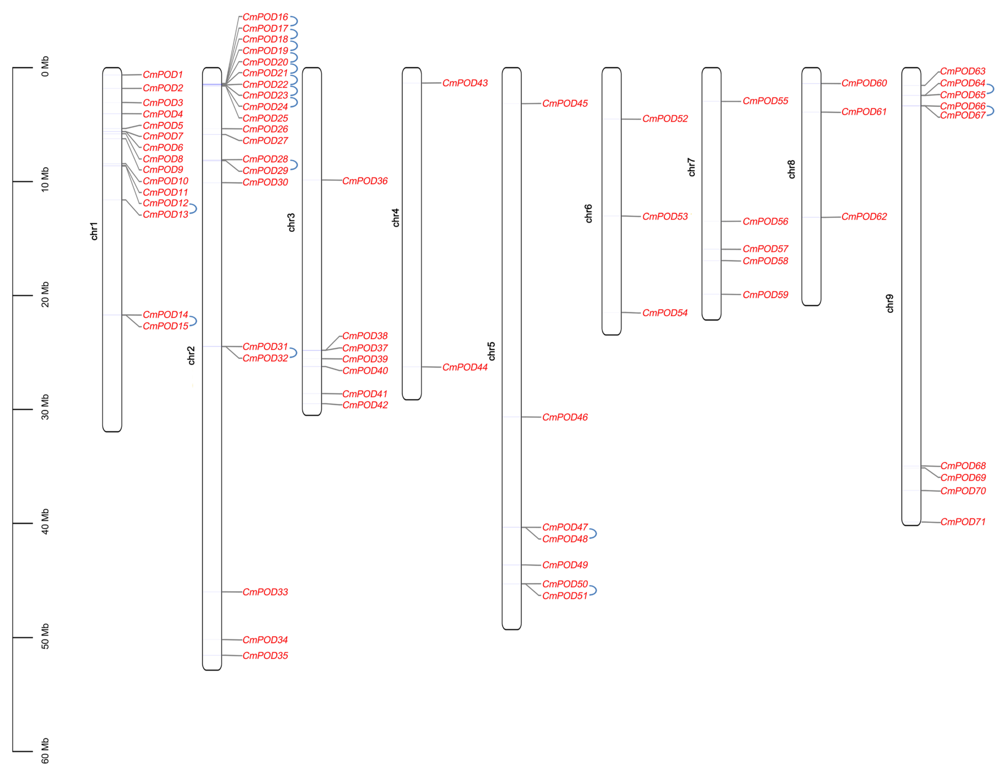 Figure 2. Chromosome localization and tandem repeat genes of CmPODs. The blue line indicates a tandem duplication between two connected genes.