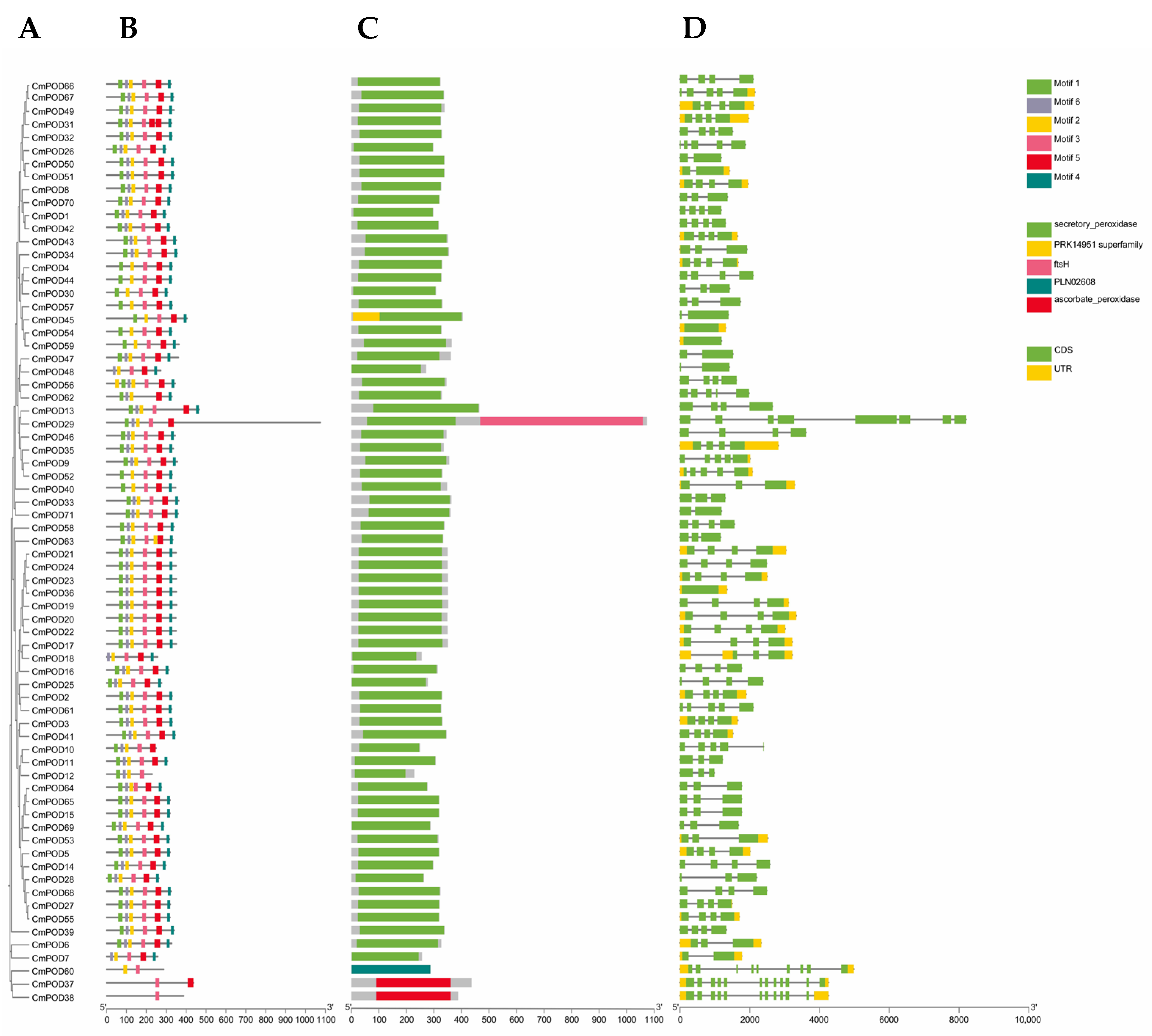 A phylogenetic tree was generated from 71 CmPOD protein sequences. (Figure 4A). Conserved motif analysis of the CmPODs (Figure 4B) was performed to identify their functional regions. Among them, 54 genes contained all six motifs, whereas 17 genes had missing motifs. CmPOD31, CmPOD56, and CmPOD63 contained two repeated conserved motifs, resulting in seven conserved motifs in total. Conserved domain analysis (Figure 4C) revealed that most genes among the CmPODs contained only a secretory POD domain. CmPOD37 and CmPOD38 contained only an ascorbate POD domain. In addition to the secretory POD domain, CmPOD29 also contained an ftsH domain, and CmPOD45 additionally contained a PRK14951 superfamily domain. These domain differences demonstrated diversity in the domains of the CmPODs. All members of the CmPODs had complete CDSs, but 41 CmPODs did not have UTRs (Figure 4D). The absence of a UTR structure may be related to functional differences among the genes.