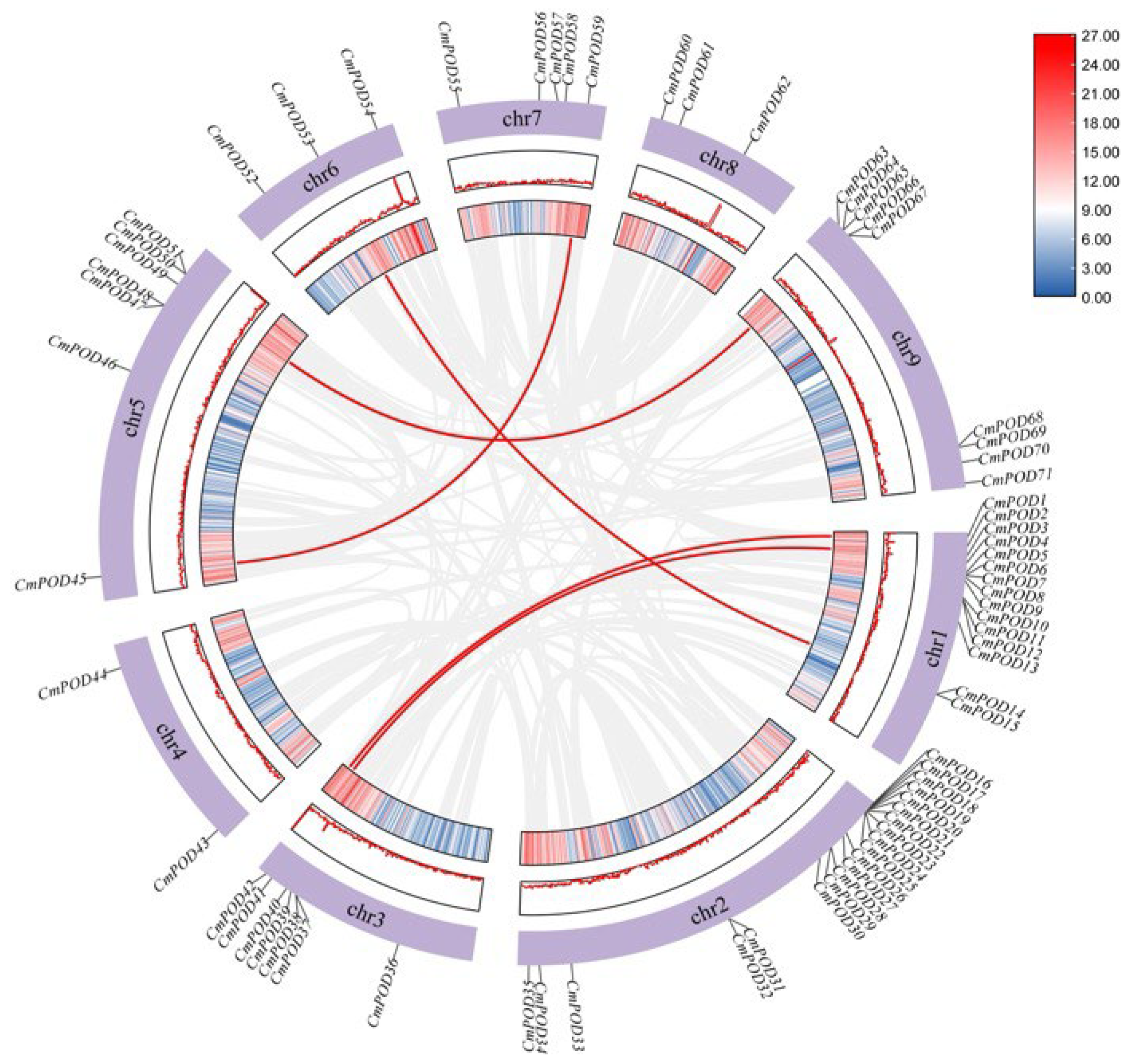 Figure 6. Analysis of chromosome collinearity and tandem repeat genes of the CmPOD family. The fragment replication of gene pairs is indicated by red lines.