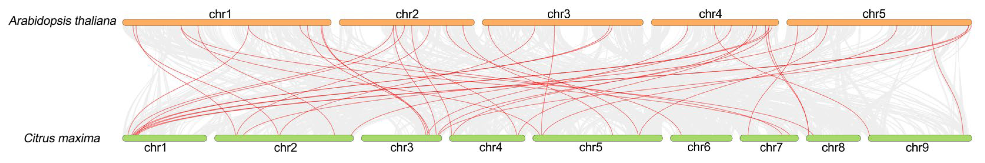 Figure 7. Colinear analysis of pomelo with Arabidopsis. The fragment replication of gene pairs is indicated by red lines.