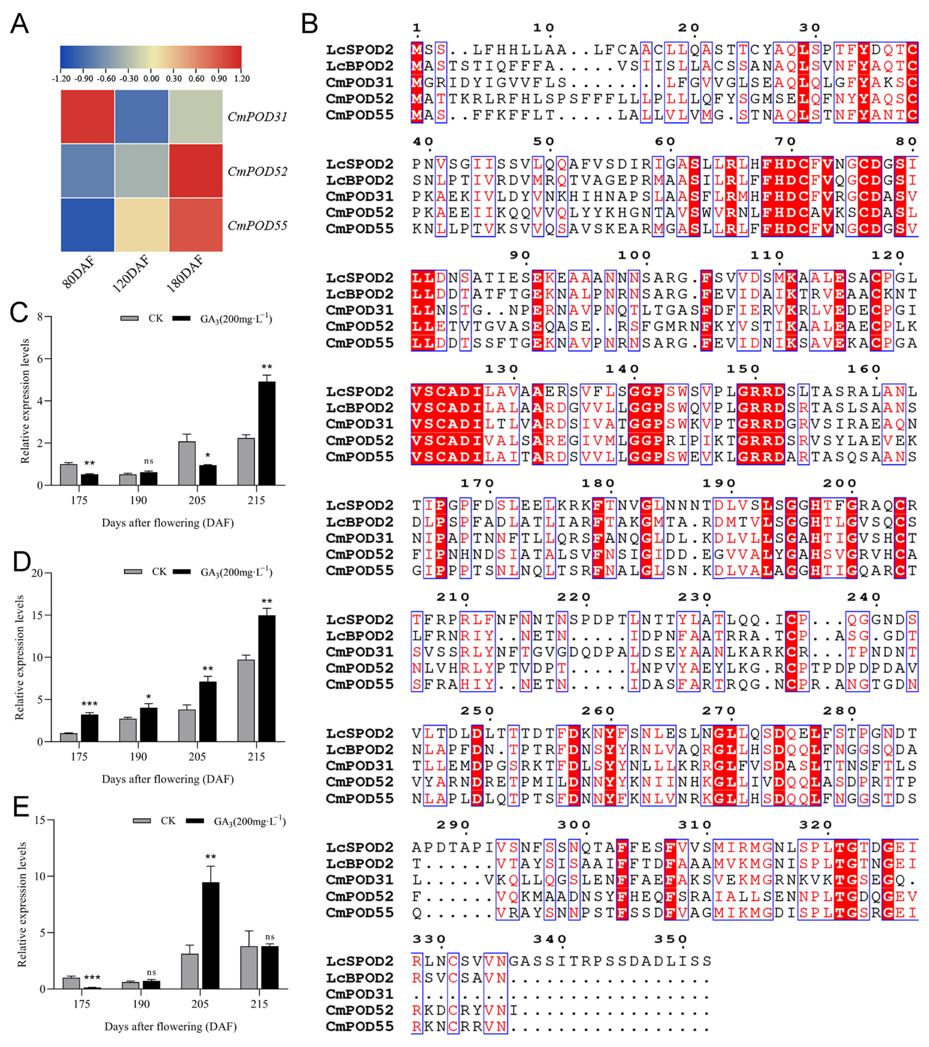 Figure 8. Acquisition and expression analysis of BPOD genes. (A) Transcript abundance heatmap of CmPODs. (B) Multiple comparisons of amino acid sequences. White text on a red background indicates Strict Identity of amino acids at that column across all sequences; Red text on a white background indicates High Similarity of amino acids at that column across all sequences; Blue frame indicates Block of Similarity, representing a conserved structural region; Black text on a white background indicates Non-conserved residues. (C) Expression of ‘Sanhong’ CmPOD31. (D) Expression of ‘Sanhong’ CmPOD52. (E) Expression of ‘Sanhong’ CmPOD55. * indicates a significant difference at the 0.05 level (p < 0.05), ** indicates a significant difference at the 0.01 level (p < 0.01), *** indicates a significant difference at the 0.001 level (p < 0.001), and ns indicates no significant difference.
