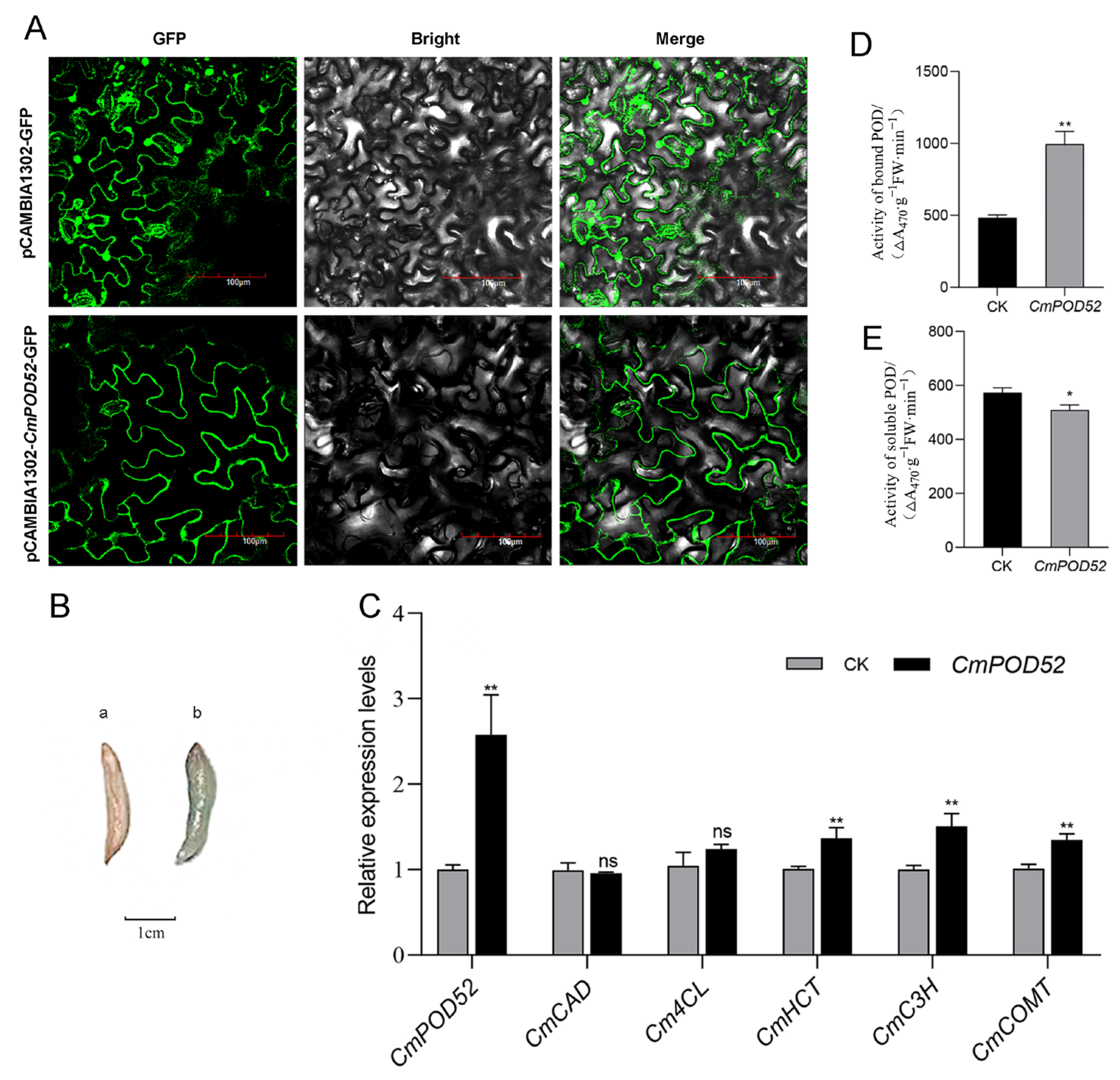 Figure 9. Subcellular localization and transient expression of CmPOD52. (A) Subcellular localization of CmPOD52. (B) Comparison of GUS-stained ‘Sanhong’ juice sacs; a: Unstained juice sacs; b: GUS-stained juice sacs. (C) Expression changes in lignin biosynthesis genes in ‘Sanhong’ pomelo juice sacs with transient CmPOD52 expression. (D) Comparison of BPOD activity in juice cells after transient transformation. (E) Comparison of SPOD activity in juice cells after transient transformation. * indicates a significant difference at the 0.05 level (p < 0.05), ** indicates a significant difference at the 0.01 level (p < 0.01), and ns indicates no significant difference.