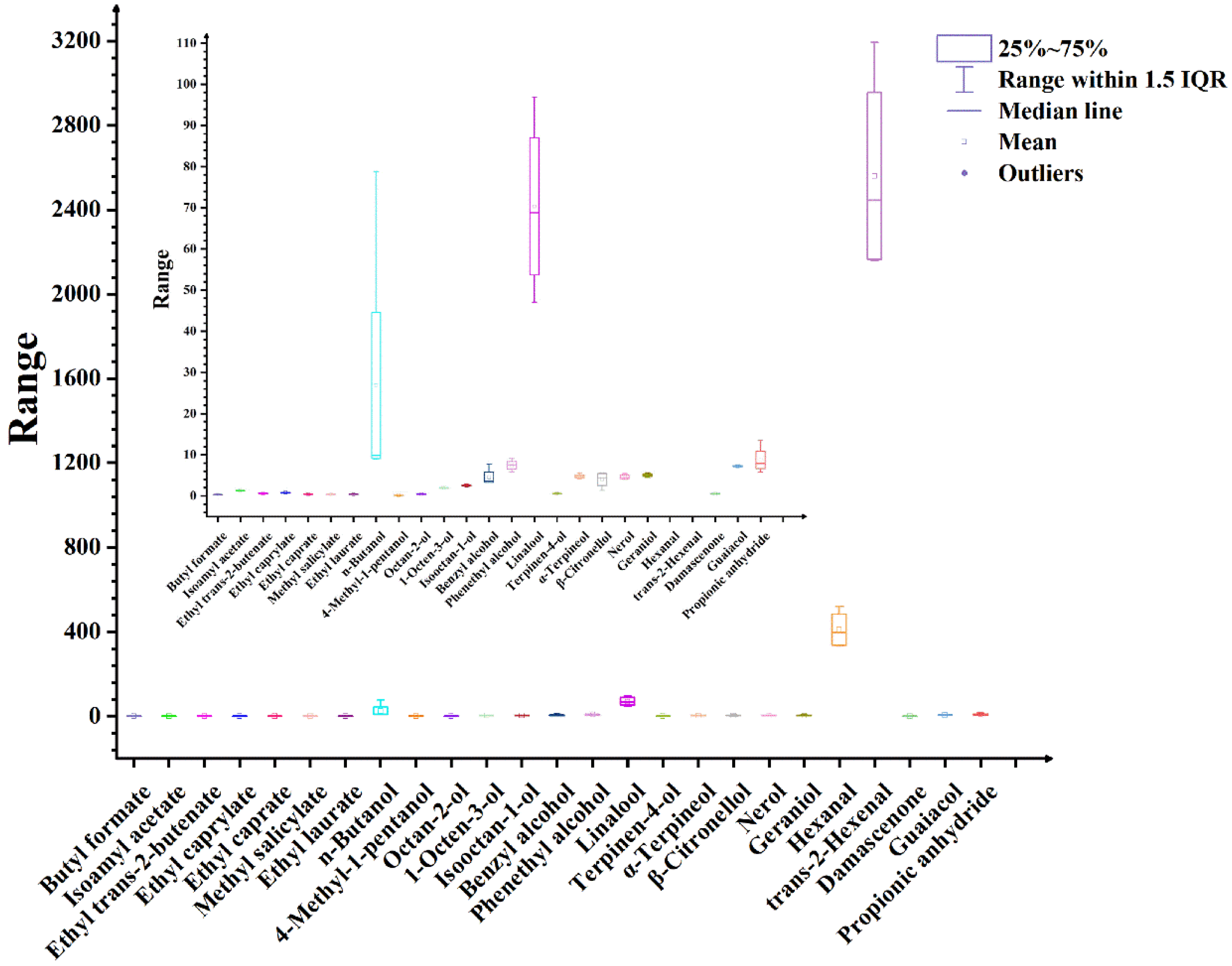 - Tan, F.; Wang, P.; Zhan, P.; Tian, H. Characterization of key aroma compounds in flat peach juice based on gas chromatography-mass spectrometry-olfactometry (GC-MS-O), odor activity value (OAV), aroma recombination, and omission experiments. Food Chem. 2022, 366, 130604. [Google Scholar] [CrossRef]
