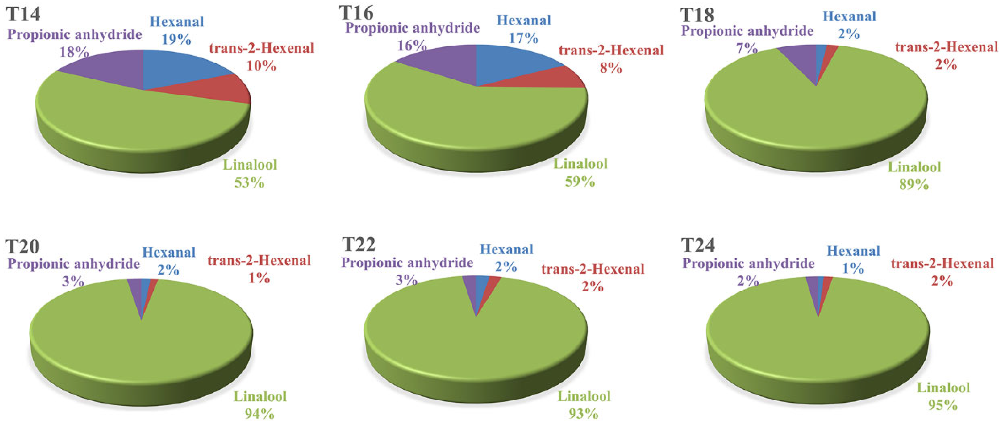 3.4.4. Impact of Different Sample Time Harvest on the OAV of Characteristic Volatile Aroma Compounds
