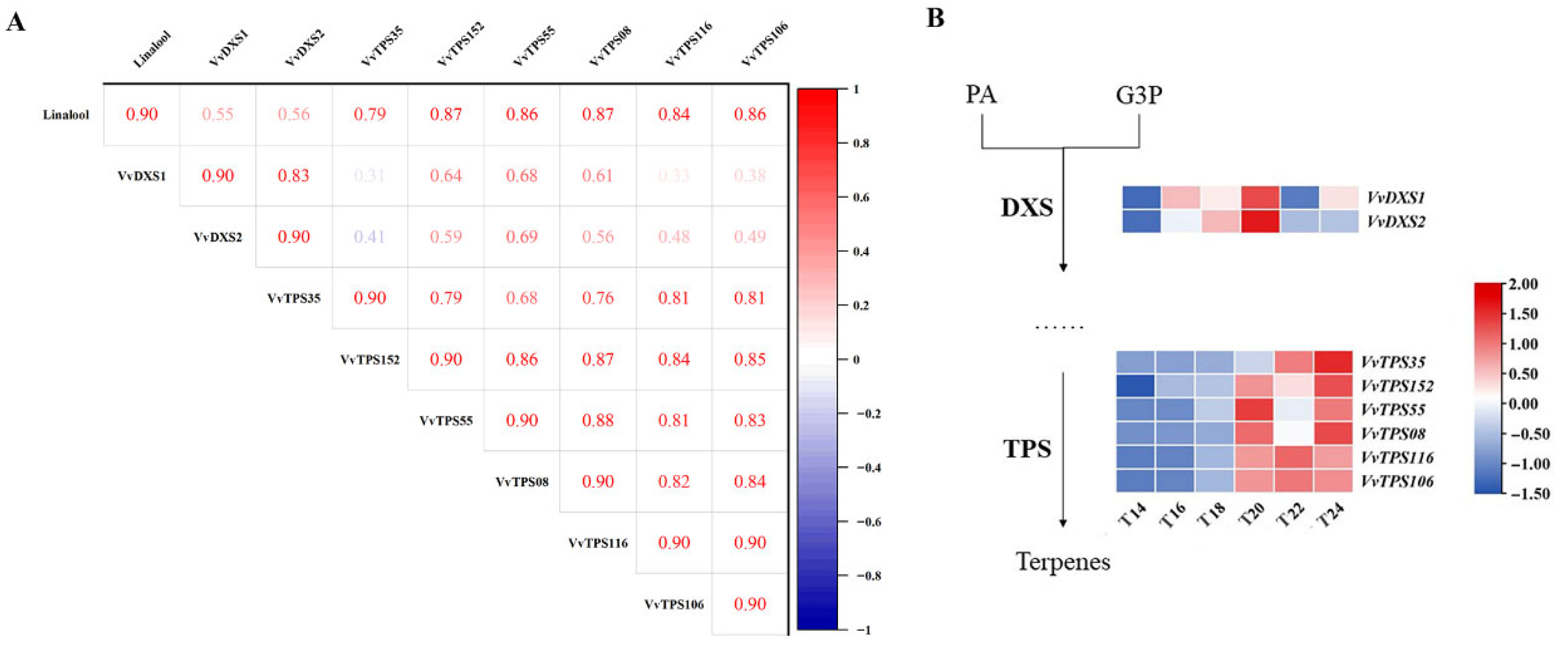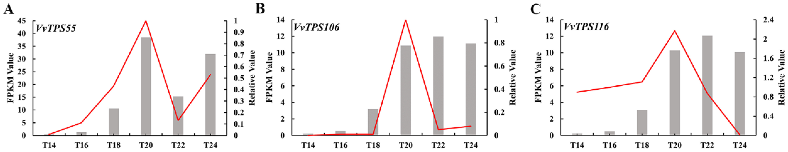 - Liu, S.Y.; Shan, B.Q.; Zhou, X.M.; Gao, W.P.; Liu, Y.R.; Zhu, B.Q.; Sun, L. Transcriptome and metabolomics integrated analysis reveals terpene synthesis genes controlling linalool synthesis in grape berries. J. Agric. Food Chem. 2022, 70, 9084–9094. [Google Scholar] [CrossRef]