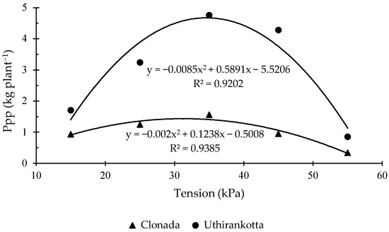 Regression analysis indicated a significant effect of soil water tension on Ppp, with a quadratic response for both genotypes. Based on the fitted models, the estimated maximum black pepper production for Clonada was 2.42 kg plant−1 at a soil water tension of 31.0 kPa, whereas for Uthirankotta, the estimated maximum was 4.69 kg plant−1 at 34.7 kPa, representing a difference of approximately 48% between genotypes under these conditions.