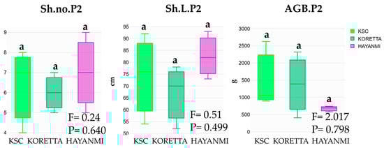 The Koretta variety presented average values between the two other ones. The shoot number was slightly higher in the Hayanmi variety, but their length was similar in both Hayanmi and Koretta (Figure 7). Aboveground biomass varied greatly for the KSC and Koretta varieties and remained approximately constant for Hayanmi, but did not differ greatly in the total tuber mass phenophase.