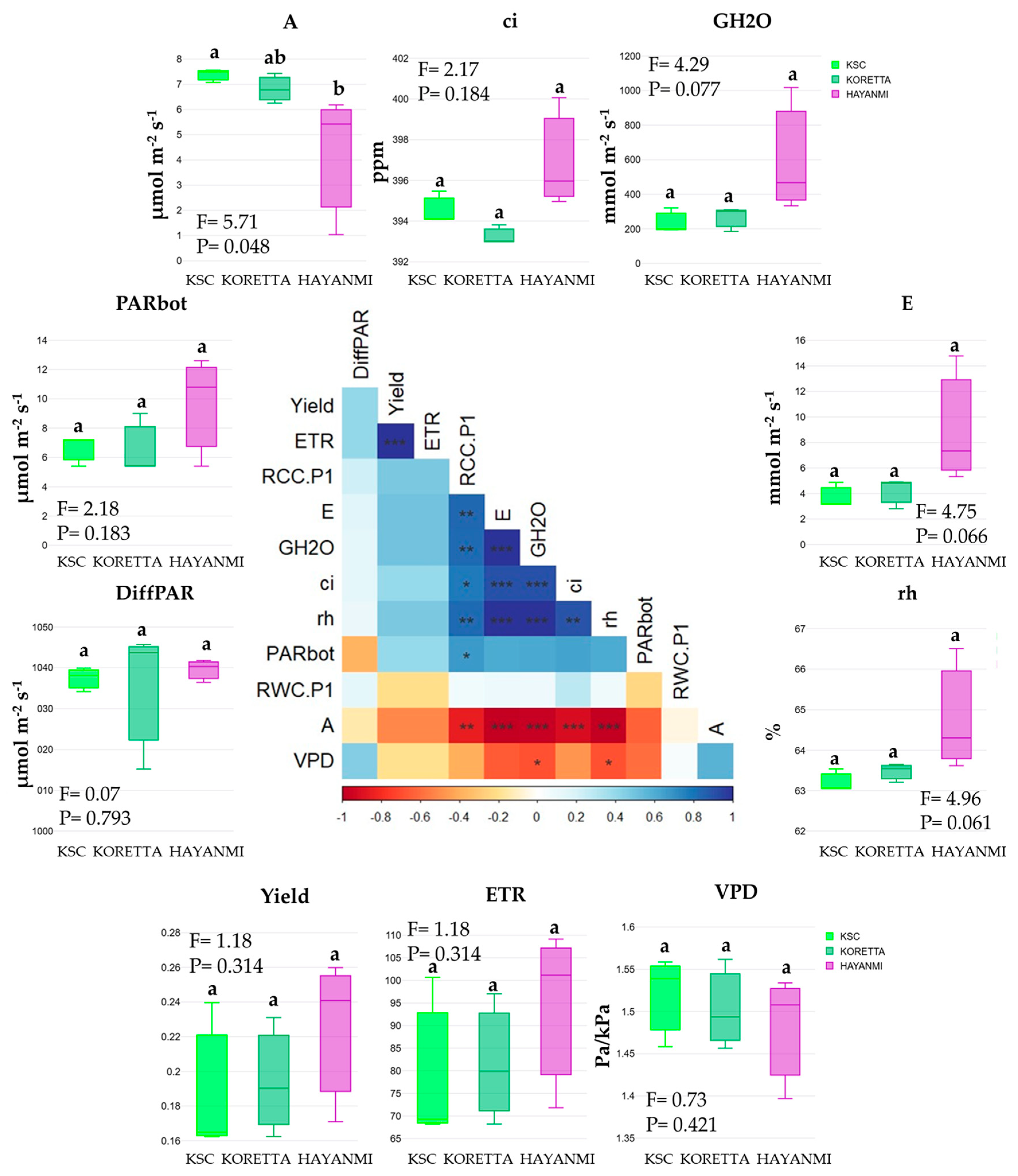 The absence of significant differences was not directly related to the trends observed in the parameters analyzed. Hayanmi reached the maximum value for GH2O, E, PARbot, Yield, ETR, and rh. Parameter ci reached the maximal value in KSC, while VPD had similar values for all three varieties.