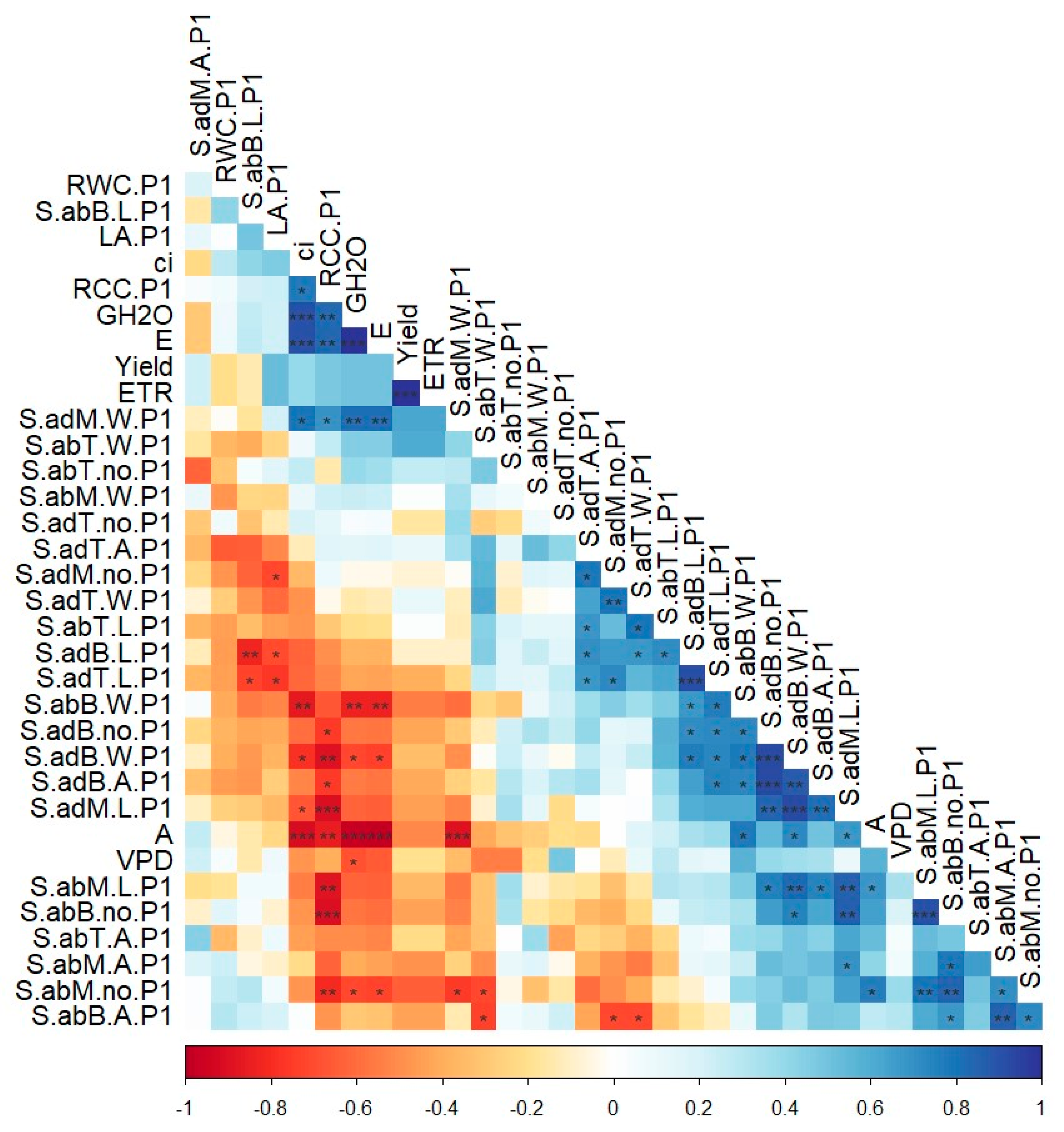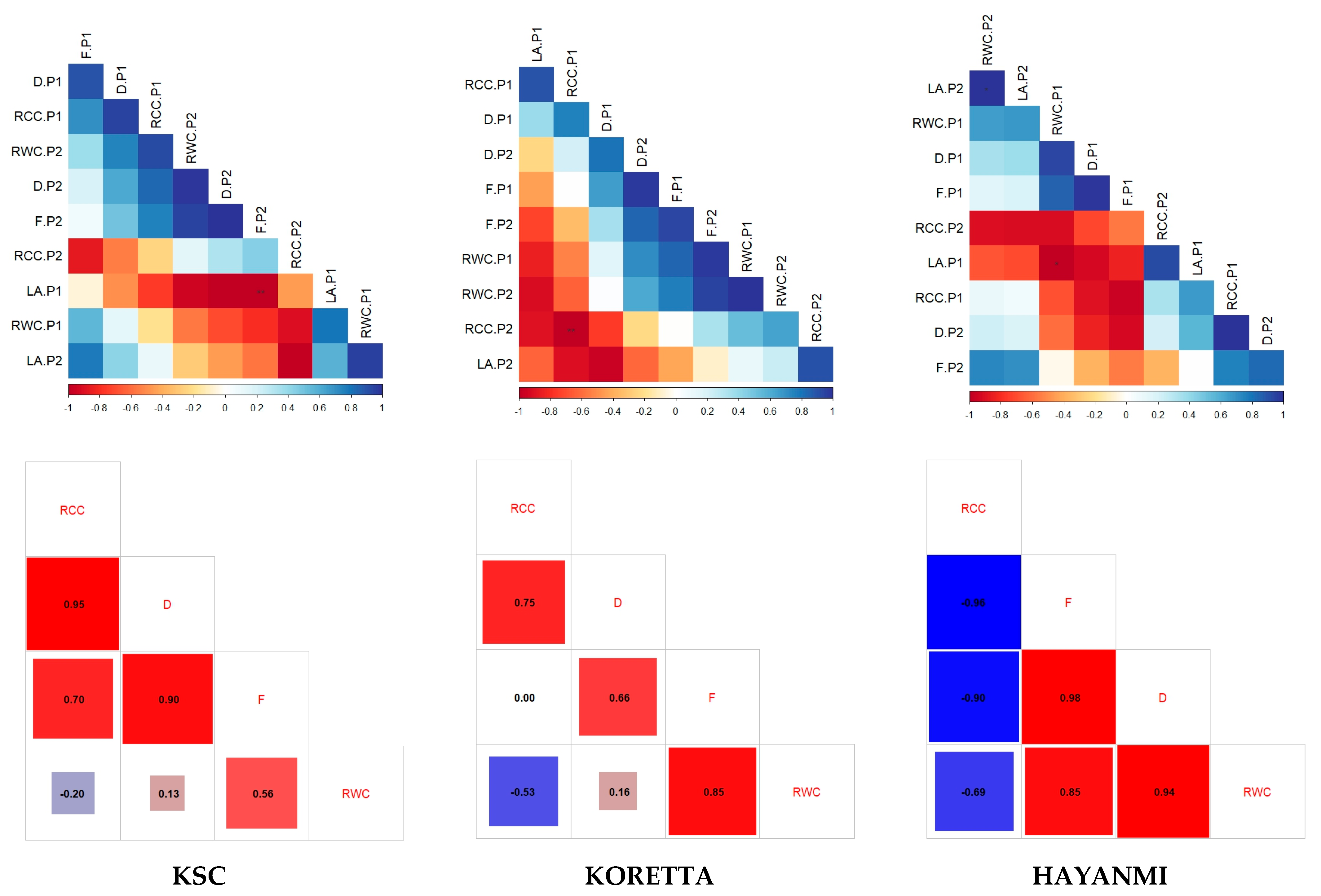 The correlations between photosynthetic parameters (Figure 1) showed three groups of interconnected parameters. The first one showed a negative relationship between VPD and GH2O, followed by the same correlation between ci and RCC.P1. The second group comprised the positive correlations between the E–RCC.P1 group and rh-A, with 10 interrelations. A singular positive relation was observed between PARbot and RCC.P1. The third group, with almost perfect positive correlations, was identified between ETR and Yield. To further investigate the relationships at the variety level, separate correlations were performed (Figure A1). KSC variety showed a significant relationship between Yield and ETR, as well as rh, E, and GH2O. Meanwhile, PARbot was negatively correlated with both Yield and ETR. For the Koretta variety, the same parameter was negatively associated with GH2O, DiffPAR, and E, whereas the association between Yield and ETR was preserved. Hayanmi exhibited the strongest correlations between parameters. GH2O, ci, E, and rh sustained each other, while Yield, ETR, and PARbot maintained the same trend of relationship. Meanwhile, both VPD and A were in opposition to GH2O, ci, E, and rh.