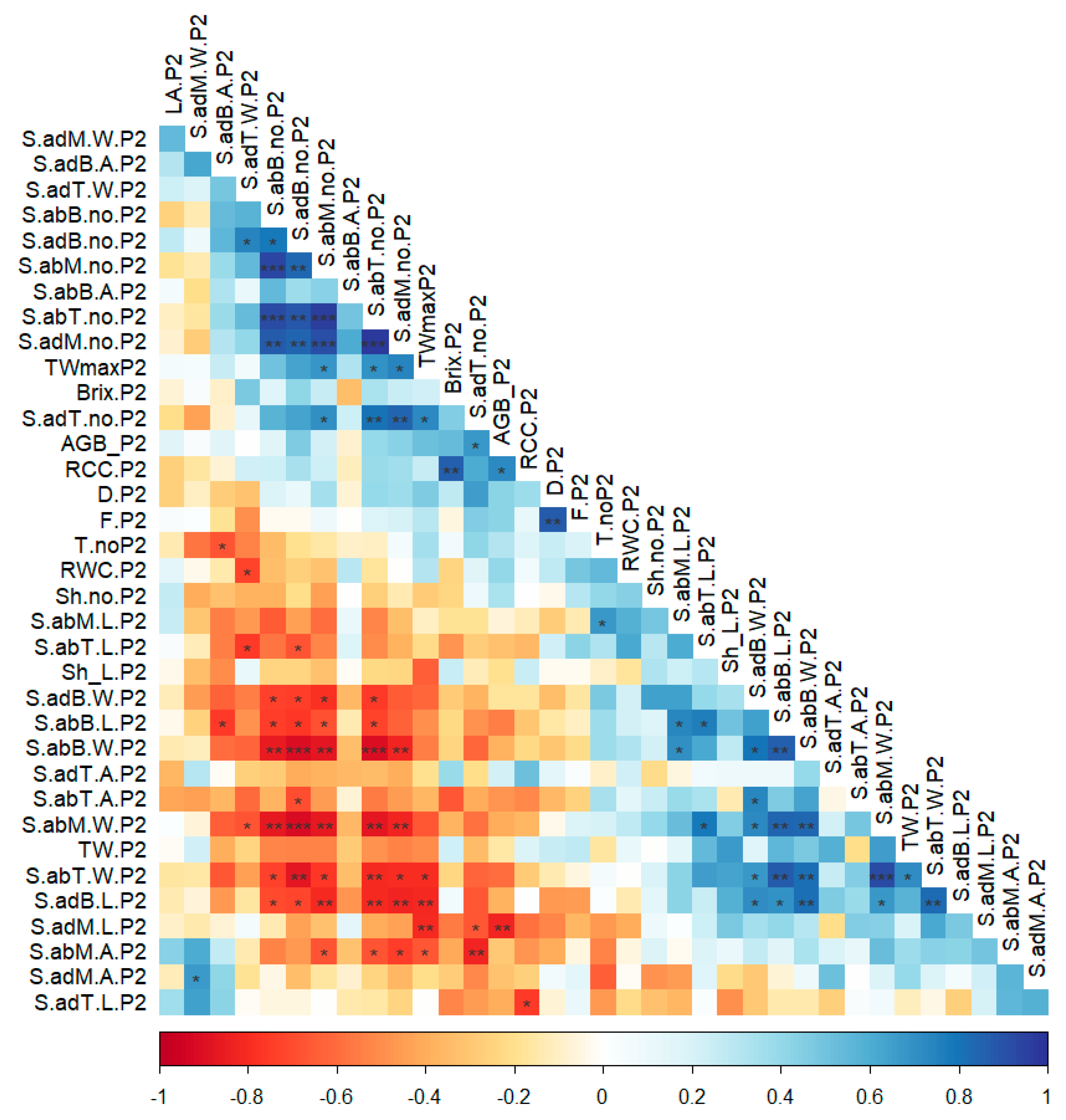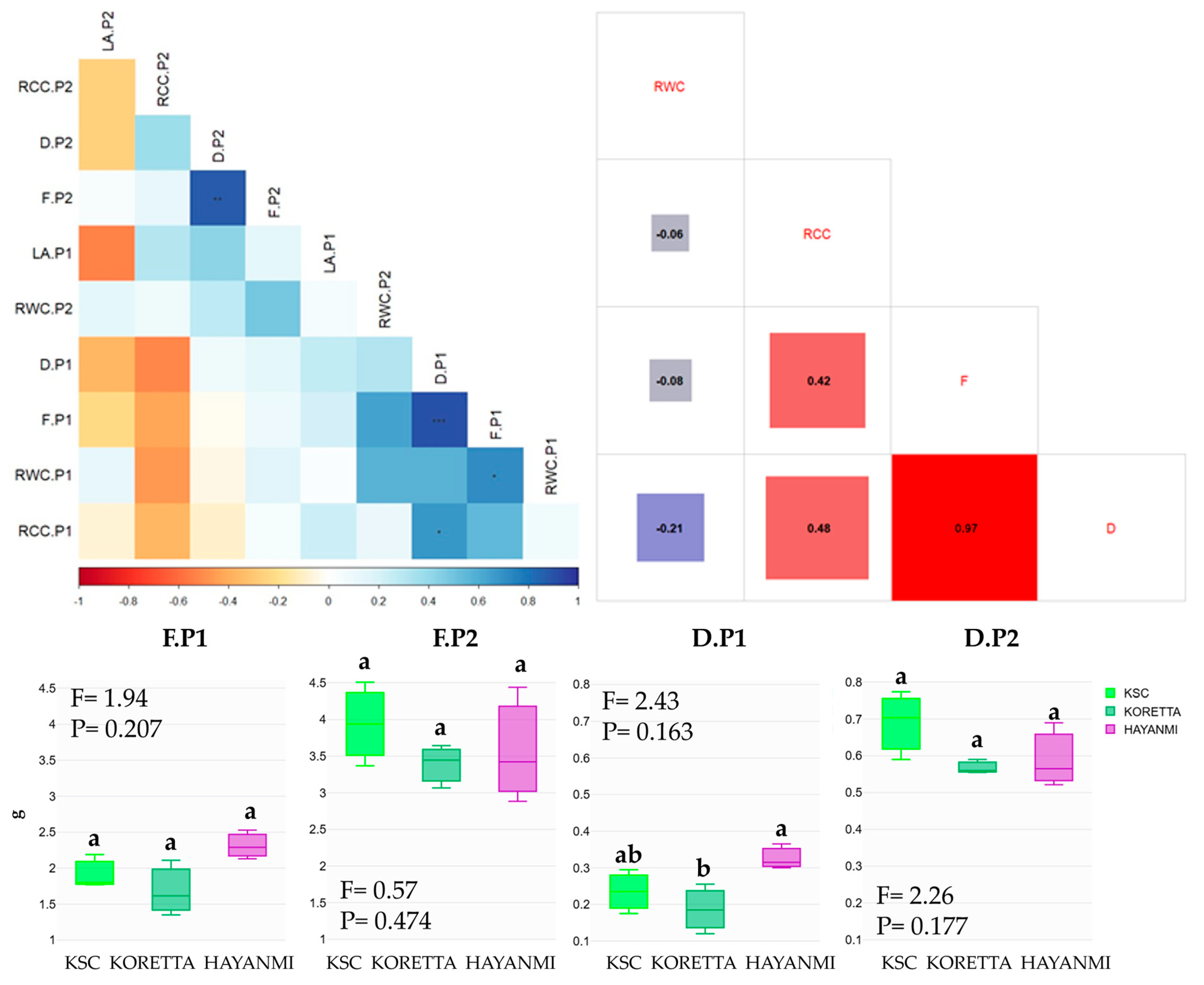 The boxplot figures were made with the help of free online tools produced by Plotly.js (v2.24.1) (https://www.statskingdom.com/advanced-boxplot-maker.html, accessed on 1 December 2025). Therefore, the inclusive quartile was defined, and the median value is shown in the figures, along with the ANOVA (F, p) and the LSD test significance. Different letters in the figures above the boxplots indicate differences between treatments at p < 0.05. All parameters were analyzed for the Pearson correlation detection using the “Hmisc” package [21] and plotted with the “corrplot” package [22]. Two types of correlation analysis were performed to assess the relationships among the parameters extracted for each variety. The first type was performed on the pooled dataset to identify generalized physiological dependencies across the studied varieties. The approach enabled the identification of indicators that remain consistent across varieties. The LSD test further explored the presence of significant differences among varieties for each parameter. The second type of correlations was performed both on pooled data and at the variety level (provided as annexes) to explore the relations between photosynthetic parameters, chlorophyll, water content, and biomass features.