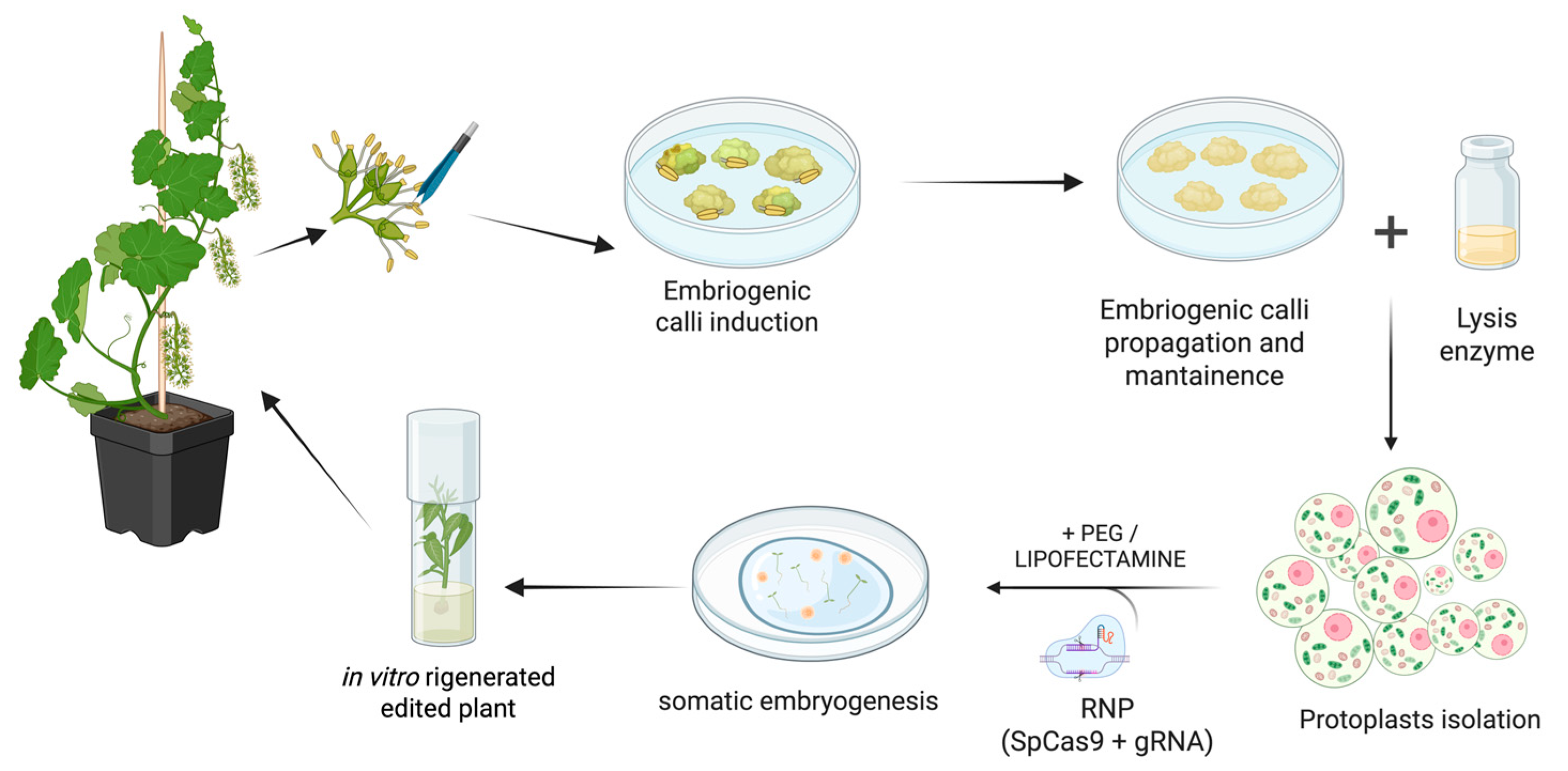 - Böttcher, C.; McDavid, D.; Jermakow, A.M.; Iocco-Corena, P.; Arunasiri, N.; Maffei, S.M.; Boss, P.K. Efficient DNA-Free Protoplast Gene Editing of Elite Winegrape Cultivars for the Generation of Clones With Reduced Downy Mildew Susceptibility. Aust. J. Grape Wine Res. 2025, 2025, 8867814. [Google Scholar] [CrossRef]