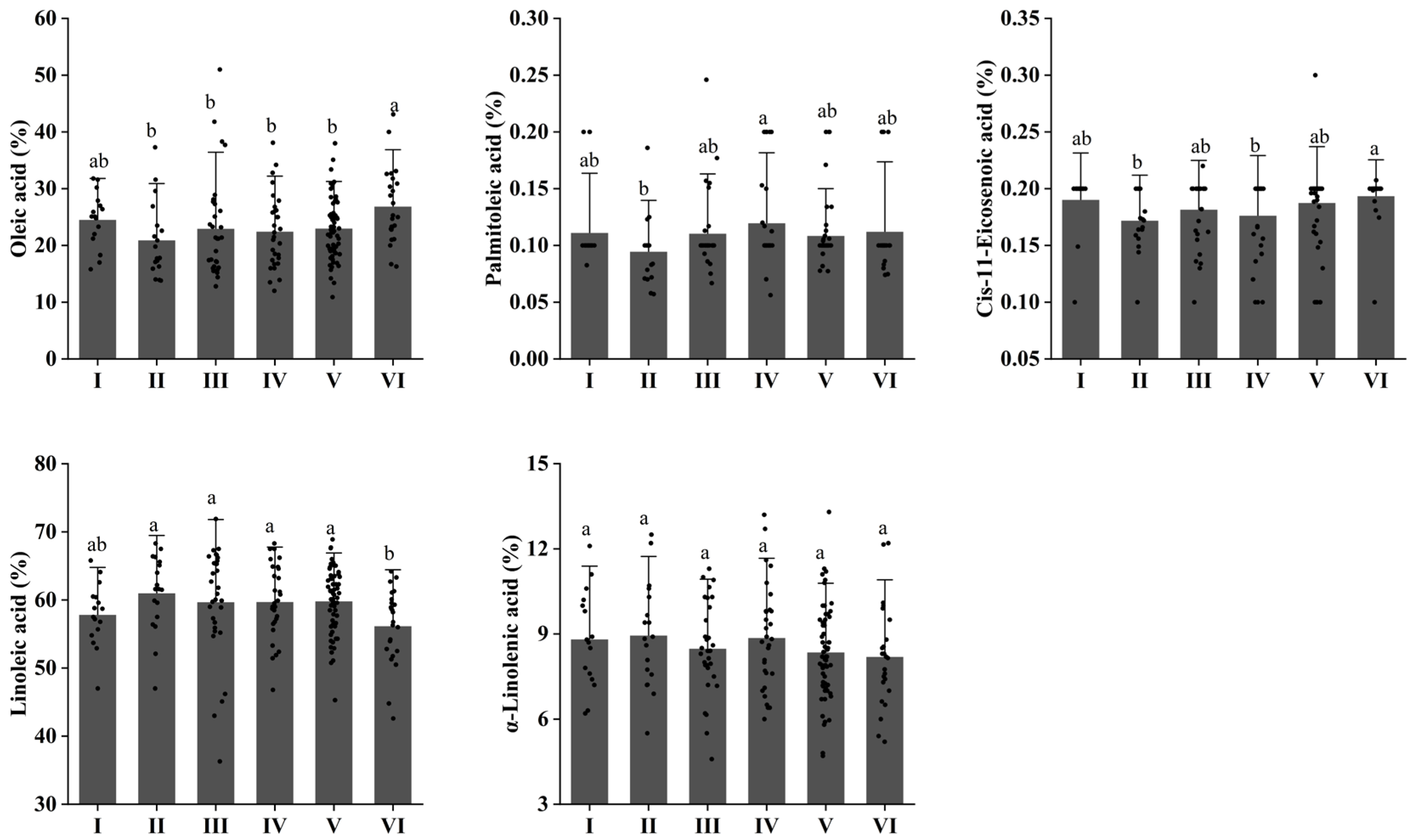 | Palmitoleic acid (%) | 0.11 | 0.034 | 0.246 | 0.056 | 0.19 | 0.31 |