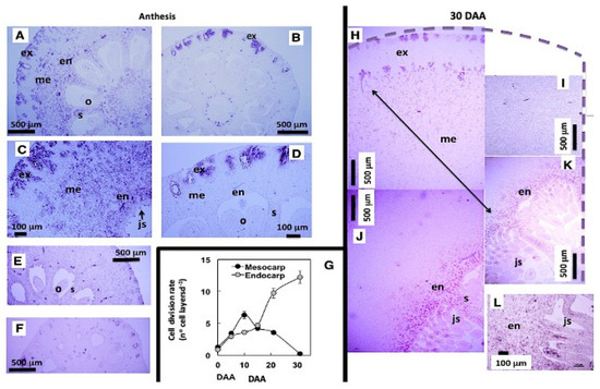 In situ hybridization of GA20ox2 transcripts in Satsuma and Clementine ovaries. (A–D): Satsuma (A,C) and Clementine (B,D) ovaries at anthesis hybridized with the antisense probe showing GA20ox2 expression (purple staining); (E–F) Satsuma (E) and Clementine (F) ovaries hybridized with the sense probe as a negative control; (G)Time-course of cell division rate in Satsuma mesocarp and endocarp. Cross-section of the Satsuma ovary 30 days after anthesis (H–K); the 4 pictures are from the same fruit and rebuild the GA20ox2 signal observed along the pericarp (purple staining), which was high in the endocarp (J,K) and absent in the mesocarp (H–J); (L) detail of the signal observed in the endocarp and juice vesicles. en: endocarp; ex: exocarp; js: juice sacs; me: mesocarp; o: ovules; s: septa. DAA: days after anthesis. From [19] with permission.