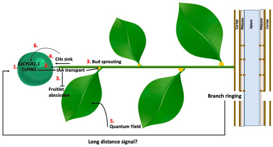 In citrus, once mineral and water requirements are met, competition for carbohydrate becomes the primary factor driving fruitlet abscission [76,77,78]. During the fruit set period, ovaries or fruitlets that fail to sustain a high growth rate due to insufficient nutrient allocation are eventually shed. Consequently, peak competition for carbohydrates coincides with the highest rates of reproductive organ abscission. However, this competition is not limited to fruits alone; vegetative development also competes for C resources [76]. Studies on alternate bearing have shown that fruits accumulate substantial amounts of C at the expense of shoot development, with an inverse correlation between monthly C accumulation in fruits and shoot dry weight gain. The presence of a strong C sink, such as developing fruit, restricts C availability to other competing sinks, including growing shoots. Consequently, as fruit C demand increases, vegetative growth declines [10]. Experiments using 13C labeling indicate that 13CO2 uptake is influenced by fruit presence. Young shoots on fruit-bearing branches assimilate less isotope compared to those on non-fruiting branches. Moreover, within the same branch, growing fruit exhibits a higher 13C uptake than shoots [10].