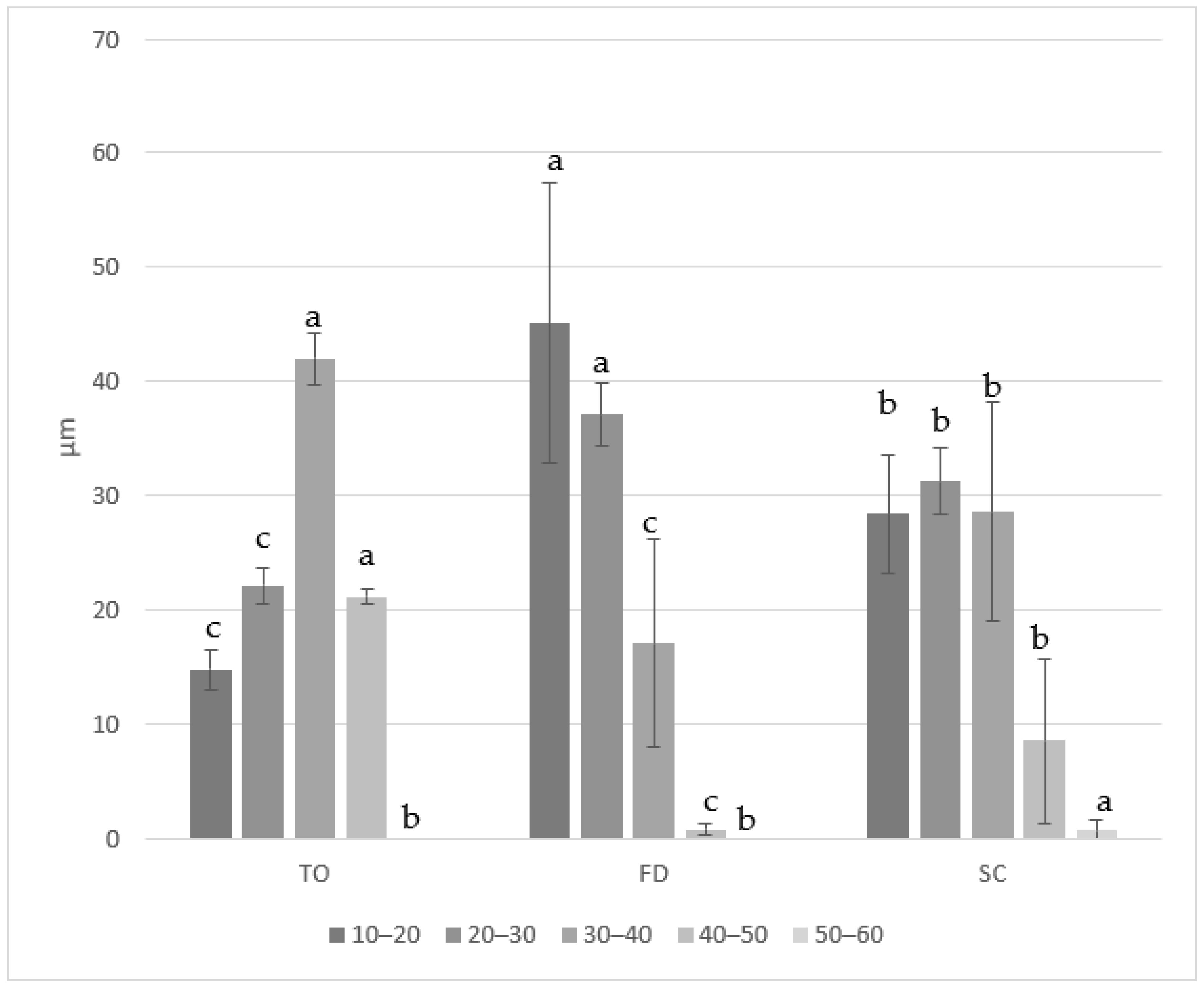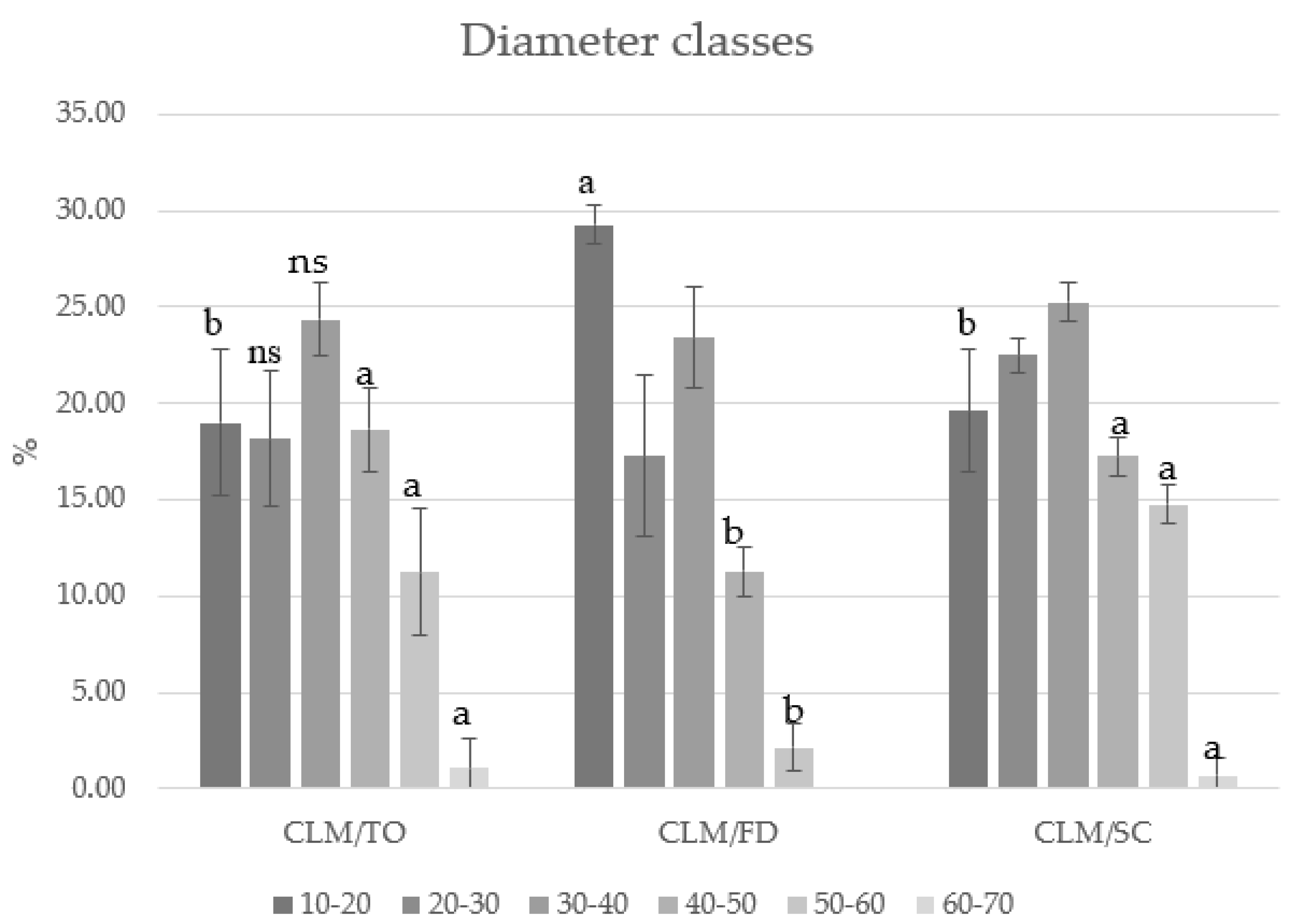 | CLM/TO | 15.71 ± 2.2 a | 0.35 ± 0.08 a | 70 ± 10 ns | 57 ± 11 ns | 345.65 ± 28 b | 227 ± 32 a | 18.77 ± 1.2 a | 20.99 ± 1.9 a | 53.12 ± 6.2 ns |