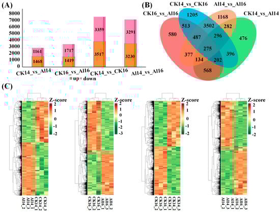 To characterize transcriptional responses to Al stress, pairwise comparisons were conducted to identify DEGs among the sample groups. A total of 2629 DEGs were identified in the CK14 vs. Al14 comparison, including 1468 upregulated and 1161 downregulated genes. In CK16 vs. Al16 comparison, 3136 DEGs were detected, comprising 1419 upregulated and 1717 downregulated genes. Comparisons between cultivars revealed 6876 DEGs (3517 upregulated and 3359 downregulated) in CK14 vs. CK16 and 6521 DEGs (3230 upregulated and 3291 downregulated) in Al14 vs. Al16 (Figure 1A). Across all the comparison groups, the number of upregulated genes exceeded that of downregulated genes. Notably, 275 core DEGs were commonly identified in both cultivars in response to Al stress. In addition, cultivar-specific DEGs were detected, including 470 in CK14 vs. Al14, 580 in CK16 vs. Al16, 1205 in CK14 vs. CK16, and 1168 in Al14 vs. Al16 (Figure 1B). Hierarchical clustering analysis further revealed distinct expression patterns among the different treatment groups and cultivars (Figure 1C).