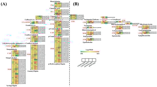 Heatmaps showing expression levels of key genes in (A) phenylpropanoid biosynthesis and (B) flavonoid biosynthesis pathways under CK16 vs. Al16 and CK14 vs. Al14 comparisons. PAL, phenylalanine ammonia-lyase; 4CL, 4-coumarate -CoA ligase; C4H, trans-cinnamate4-monooxygenase; HCT, shikimate O-hydroxycinnamoyltransferase; CCoAOMT, caffeoyl-CoA O-methyltransferase; CCR, cinnamoyl-CoA reductase; COMT, caffeic acid 3 Omethyltransferase; CAD, cinnamyl-alcohol dehydrogenase; POD, peroxidase; CHS, chalcone synthase; CHI, chalcone isomerase; F3′5′H, flavonoid 3′,5′ hydroxylase; F3′M, flavonoid 3′ monooxygenase; F3H, naringenin 3-dioxygenase; DFR, bi-functional dihydroflavonol 4 -reductase; ANR, anthocyanidin reductase.