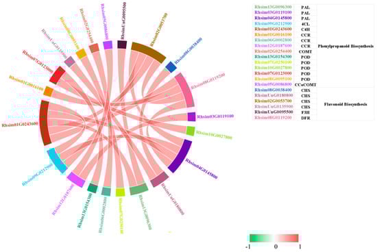 To further explore regulatory interactions among these pathways under Al stress, Pearson correlation analysis was conducted for DEGs involved in phenylpropanoid and flavonoid biosynthesis. This analysis revealed strong intergene correlations and identified 21 highly correlated hub genes (Figure 4). Among these, 15 DEGs were associated with the phenylpropanoid biosynthesis pathway, including PAL (Rhsim13G0096300, Rhsim03G0119100, Rhsim04G0145800), CCR (Rhsim01G0016100, Rhsim06G0002800, Rhsim12G0187600), POD (Rhsim13G0154300, Rhsim07G0250100, Rhsim10G0027800, Rhsim07G0123000, Rhsim08G0095100), and one gene each encoding 4CL (Rhsim09G0212900), C4H (Rhsim01G0243600), COMT (Rhsim02G0254400), and CCoAOMT (Rhsim05G0086800). Additionally, six DEGs involved in the flavonoid biosynthesis were identified, including four CHS genes (Rhsim08G0038400, RhsimUnG0180800, Rhsim02G0053700, RhsimUnG0135900), one F3H gene (RhsimUnG0095500), and one DFR gene (Rhsim08G0119200). These genes are likely represent key regulatory nodes associated with Al stress responses.
